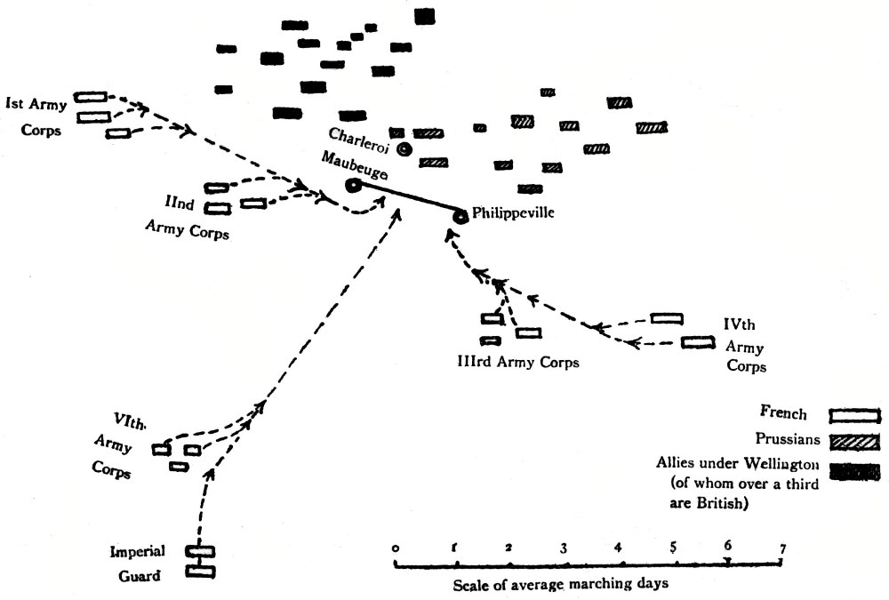 The French troops, when the order for concentration was given, stretched westward as far as Lille, eastward as far as Metz, southward as far as Paris, in the neighbourhood of which town was the Imperial Guard. The actual marching of the various units occupied a week. Napoleon was at the front on the night of the 13th of June; the whole army was upon the 14th drawn up upon a line stretched from Maubeuge to Philippeville, and the attack was ready to begin.