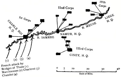 In ten days the 124,000 men, with their 370 guns, were massed upon the line between Maubeuge and Philippeville, immediately upon the frontier, and ready to cross it. The way in which the frontier was passed and the river Sambre crossed before the first actions took place form between them the preliminaries of the campaign, and must be the subject of my next section.