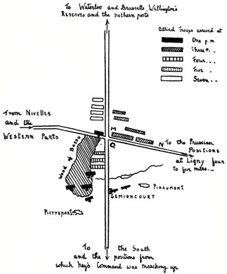 [14] The reason he was thus ignorant of what had really happened to the Prussians was, that the officer who had been sent by the chief of the Prussian staff to the Duke after nightfall to inform him of the Prussian defeat had never arrived. That officer had been severely wounded on the way, and the message was not delivered.