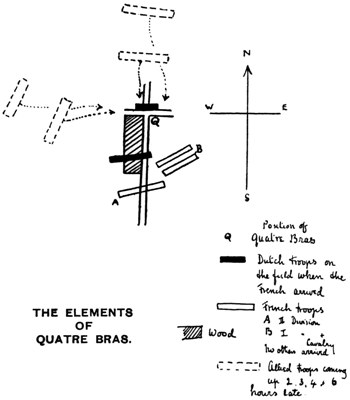 [8] It is worth remarking that Perponcher had been told by Wellington, when he first heard of Napoleon’s approach, to remain some miles off to the west at Nivelles. Wellington laboured, right up to the battle of Waterloo, under the fantastic impression that the French, or a considerable body of them, were, for some extraordinary reason, going to leave the Brussels road, go round westward and attack his right. He was, as might be expected of a defensive genius, nervous for his communications. Luckily for Wellington, Perponcher simply disobeyed these orders, left Nivelles before dawn, was at Quatre Bras before sunrise, and proceeded to act as we shall see above.