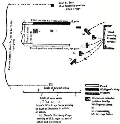 In those solemn moments, wherein the[Pg 198] Imperial Guard formed for their descent into that hollow whose further slope was to see their last feat of arms, Ziethen, with the First Prussian Corps, pressed on into the far corner the field of battle. At the far end of the long ridge of the Mont St Jean, more than a mile away, this last great body and newest reinforcement of the Emperor’s foes had emerged from the walls and thickets of Smohain and, new to the fighting, was already pushing in the weary French line that had stood the carnage of six hours. It was not enough that the Fourth Prussian Corps should have determined the day already with its 30,000 come up from the east against him; now the foremost battalions of the First coming up from the north were appearing to clinch the matter altogether.