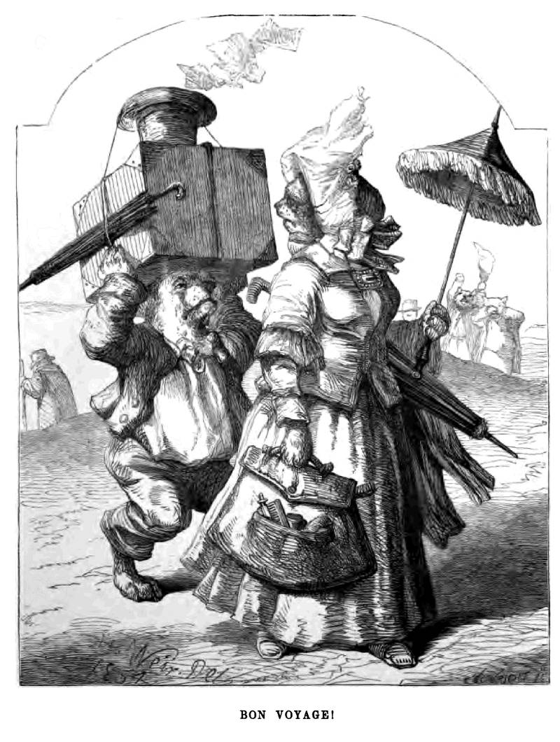 The morning at length arrived when I was to take my departure. Dressed in my second-best clothes, with a parasol in one paw,—for the sun was hot,—and with my travelling-bag, containing a few necessaries, in the other, I ventured into the streets for the first time since that memorable evening. A stout cur, whom I had hired as a valet to accompany and protect me, walked behind me with my trunk upon his head; and as I turned from the door I perceived my servants, and some other Cats whom I had at times assisted, watching me as I went, and bidding me a mournful adieu. I was affected by their gestures, and should have been more so, but that I was still in sight of my neighbours' dwellings, and was apprehensive of some disagreeable remarks. Fortunately none of them were visible. I passed their houses; I got out of the very street, but not till I had stopped at the corner and given a quiet mew to the villa where I had spent so many pleasant days, and which I was now leaving perhaps for ever. We moved on through the Cats' quarter, across one or two streets inhabited by the Dogs, and out into the open country. We soon left behind us the few straggling houses which were at the entrance of the town, and, mounting a hill, paused when we had gained the summit, partly to give a last look at the city, but more to rest my companion, who declared that his legs would never get straight again from the heavy burden which had bent them down, and that the rope with which the box was tied was positively cutting his head in two.