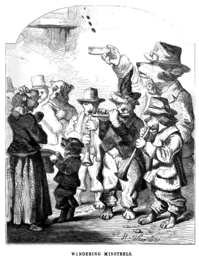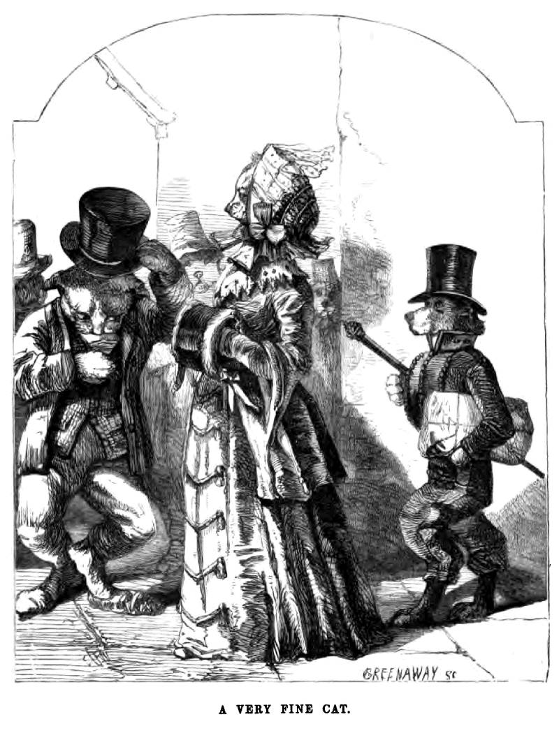 There were three mongrels, rather fantastically dressed, blowing all the breath they could spare into two flageolets and a flute, but as one or the other was forced to stop every now and then to recover his wind, and always managed to do so in the most pathetic part, the effect was more curious than agreeable. Several animals were standing round, and a little wee Pup went about among them collecting, with a hat big enough to hold a great deal more than was ever put into it. But the creature who most attracted my attention was a huge lump of a Bear, with so ugly a face that it made me quite shudder to look at him, who seemed the master of the band, and held a tray up to the various windows where any heads had been put out to listen to the music. He was in the act of doing so, when I came up, to the window of a large house, where a fat, white Puss, evidently the servant of some rich family, was nursing a darling little Kitten that was mewing with delight at the scene below.