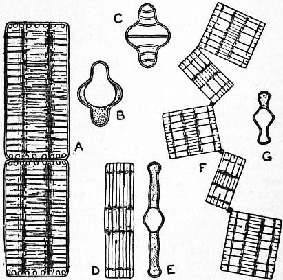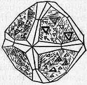 Scientific Characters.—The majority of minerals are found most commonly in masses which can with difficulty be recognized as aggregates of crystalline grains, and occur comparatively seldom as distinct crystals; but the diamond is almost always found in single crystals, which show no signs of previous attachment to any matrix; the stones were, until the discovery of the South African mines, almost entirely derived from sands or gravels, but owing to the hardness of the mineral it is rarely, if ever, water-worn, and the crystals are often very perfect. The crystals belong to the cubic system, generally assuming the form of the octahedron (fig. 1), but they may, in accordance with the principles of crystallography, also occur in other forms symmetrically derived from the octahedron,—for example, the cube, the 12-faced figure known as the rhombic dodecahedron (fig. 2), or the 48-faced figure known as the hexakis-octahedron (fig. 3), or in combinations of these. The octahedron faces are usually smooth; most of the other faces are rounded (fig. 4). The cube faces are rough with protruding points. The cube is sometimes found in Brazil, but is very rare among the S. African stones; and the dodecahedron is perhaps more common in Brazil than elsewhere. There is often a furrow running along the edges of the octahedron, or across the edges of the cube, and this indicates that the apparently simple crystal may really consist of eight individuals meeting at the centre; or, what comes to the same thing, of two individuals interpenetrating and projecting through each other. If this be so the form of the diamond is really the tetrahedron (and the various figures derived symmetrically from it) and not the octahedron Fig. 5 shows how the octahedron with furrowed edge may be constructed from two interpenetrating tetrahedra (shown in dotted lines). If the grooves be left out of account, the large faces which have replaced each tetrahedron corner then make up a figure which has the aspect of a simple octahedron. Such regular interpenetrations are known in crystallography as “twins.” There are also twins of diamond in which two octahedra (fig. 6) are united by contact along a surface parallel to an octahedron face without interpenetration. On account of their resemblance to the twins of the mineral spinel (which crystallizes in octahedra) these are known as “spinel twins.” They are generally flattened along the plane of union. The crystals often display triangular markings, either elevations or pits, upon the octahedron faces; the latter are particularly well defined and have the form of equilateral triangles (fig. 7). They are similar to the “etched figures” produced by moistening an octahedron of alum, and have probably been produced, like them, by the action of some solvent. Similar, but somewhat different markings are produced by the combustion of diamond in oxygen, unaccompanied by any rounding of the edges.