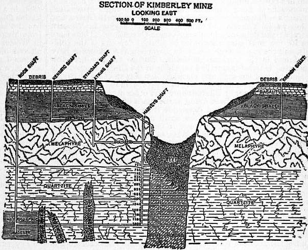 In fig. 13, Plate II., the sequence of the basalt, shale and melaphyre is clearly visible on the sides of the pit; and fig. 8 shows how the crater or “pipe” of blue ground has penetrated these rocks and also the underlying quartzite. The workings at De Beers had extended into the still more deeply seated granite in 1906. Figure 9, Plate I., shows the top of the De Beers’ crater with basalt overlying the shale. Figure 8 also explains the modern system of mining introduced by Gardner Williams. A vertical shaft is sunk in the vicinity of the mine, and from this horizontal tunnels are driven into the pipe at different levels separated by intervals of 40 ft. Through the blue ground itself on each level a series of parallel tunnels about 120 ft. apart are driven to the opposite side of the pipe, and at right angles to these, and 36 ft. apart, another series of tunnels. When the tunnels reach the side of the mine they are opened upwards and sideways so as to form a large chamber, and the overlying mass of blue ground and débris is allowed to settle down and fill up the gallery. On each level this process is carried somewhat farther back than on the level below (fig. 8); material is thus continually withdrawn from one side of the mine and extracted by means of the rock shaft on the opposite side, while the superincumbent débris is continually sinking, and is allowed to fall deeper on the side farthest from the shaft as the blue ground is withdrawn from beneath it. In 1905 the main shaft had been sunk to a depth of 2600 ft. at the Kimberley mine.