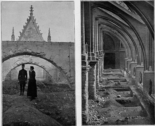 En ce moment, il ne demeure de cette merveille que le gros oeuvre de pierre, les murailles audacieuses et la voûte qui abrite l'église. De l'admirable fouillis de statues qui animaient l'extérieur de la tour du Nord-Ouest, subsistent seulement des tronçons, des fragments; et si quelques-unes des sculptures ont échappé à la destruction, elles ont été à ce point endommagées par l'incendie qu'elles ne sont plus réparables. Parmi celles qui ornaient la tour du Sud-Ouest, on en distingue beaucoup qui sont sorties presque indemnes du désastre; mais d'autres se sont écroulées ou sont gravement endommagées. Quant aux belles images qui encadraient les portes, à l'intérieur de la basilique, il n'en reste qu'un amas de pierres calcinées.