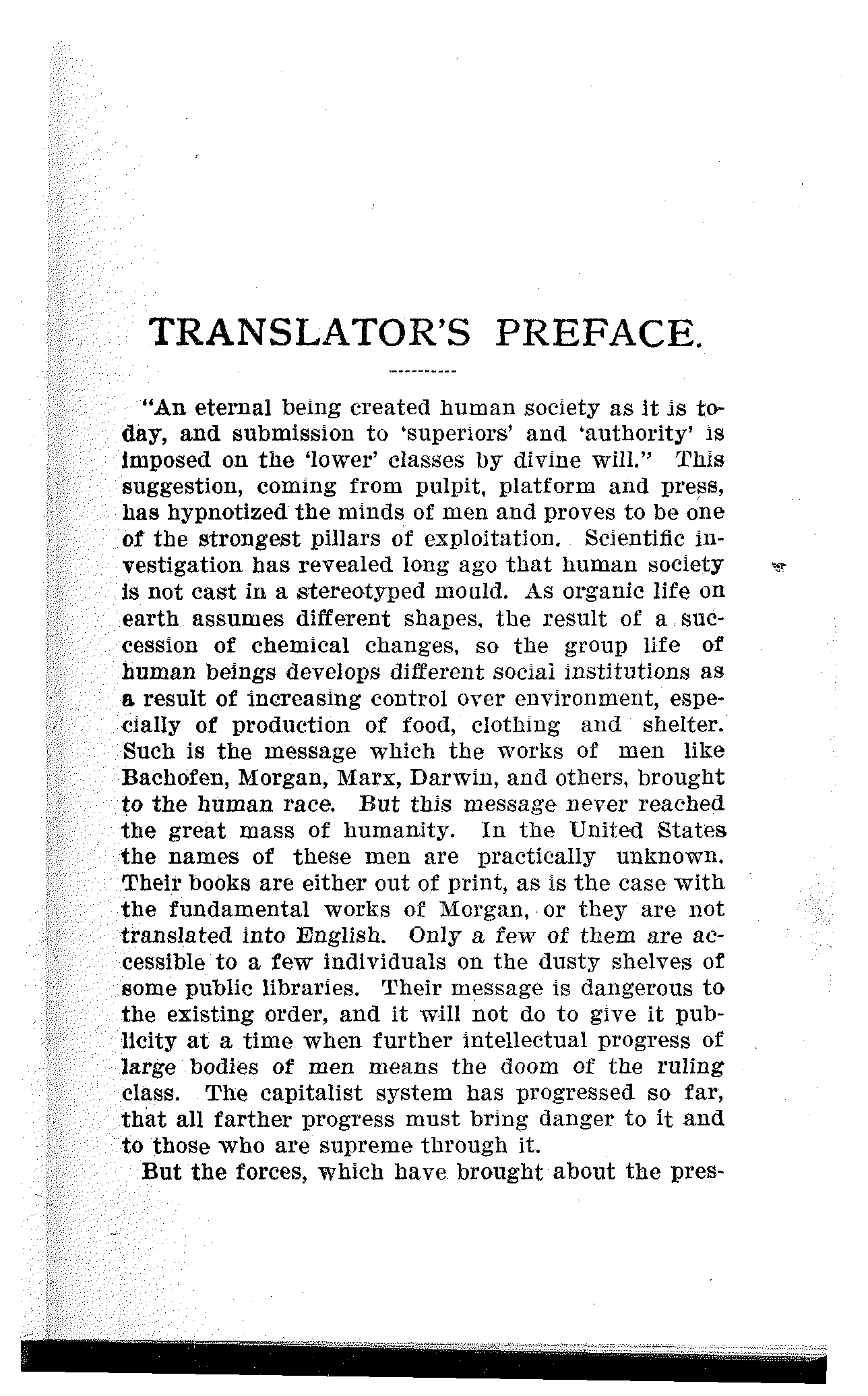 "An eternal being created human society as it is to-day, and submission to 'superiors' and 'authority' is imposed on the 'lower' classes by divine will." This suggestion, coming from pulpit, platform and press, has hypnotized the minds of men and proves to be one of the strongest pillars of exploitation. Scientific investigation has revealed long ago that human society is not cast in a stereotyped mould. As organic life on earth assumes different shapes, the result of a succession of chemical changes, so the group life of human beings develops different social institutions as a result of increasing control over environment, especially of production of food, clothing and shelter. Such is the message which the works of men like Bachofen, Morgan, Marx, Darwin, and others, brought to the human race. But this message never reached the great mass of humanity. In the United States the names of these men are practically unknown. Their books are either out of print, as is the case with the fundamental works of Morgan, or they are not translated into English. Only a few of them are accessible to a few individuals on the dusty shelves of some public libraries. Their message is dangerous to the existing order, and it will not do to give it publicity at a time when further intellectual progress of large bodies of men means the doom of the ruling class. The capitalist system has progressed so far, that all farther progress must bring danger to it and to those who are supreme through it.