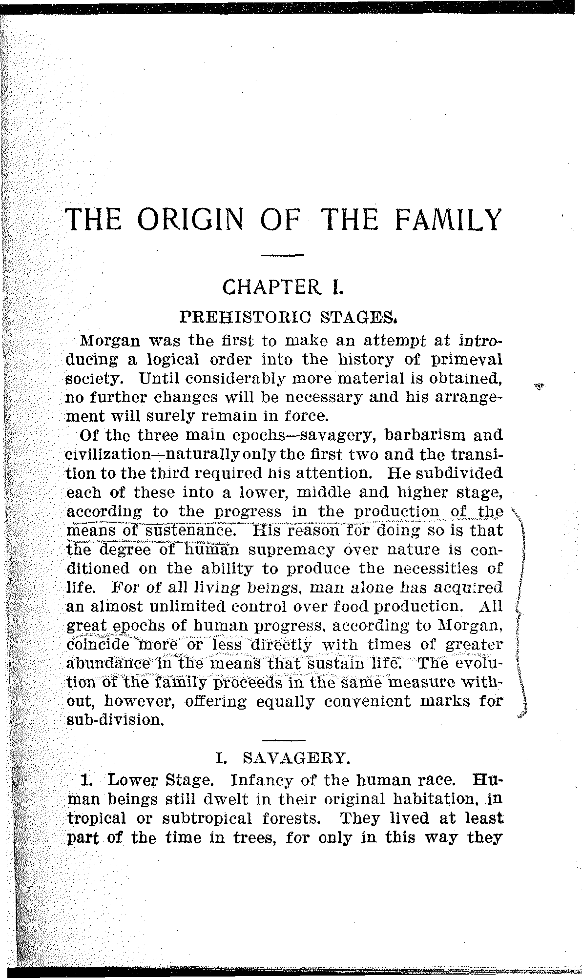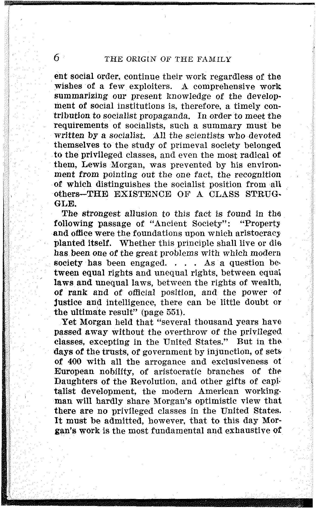 But the forces, which have brought about the [6]present social order, continue their work regardless of the wishes of a few exploiters. A comprehensive work summarizing our present knowledge of the development of social institutions is, therefore, a timely contribution to socialist propaganda. In order to meet the requirements of socialists, such a summary must be written by a socialist. All the scientists who devoted themselves to the study of primeval society belonged to the privileged classes, and even the most radical of them, Lewis Morgan, was prevented by his environment from pointing out the one fact, the recognition of which distinguishes the socialist position from all others—THE EXISTENCE OF A CLASS STRUGGLE.