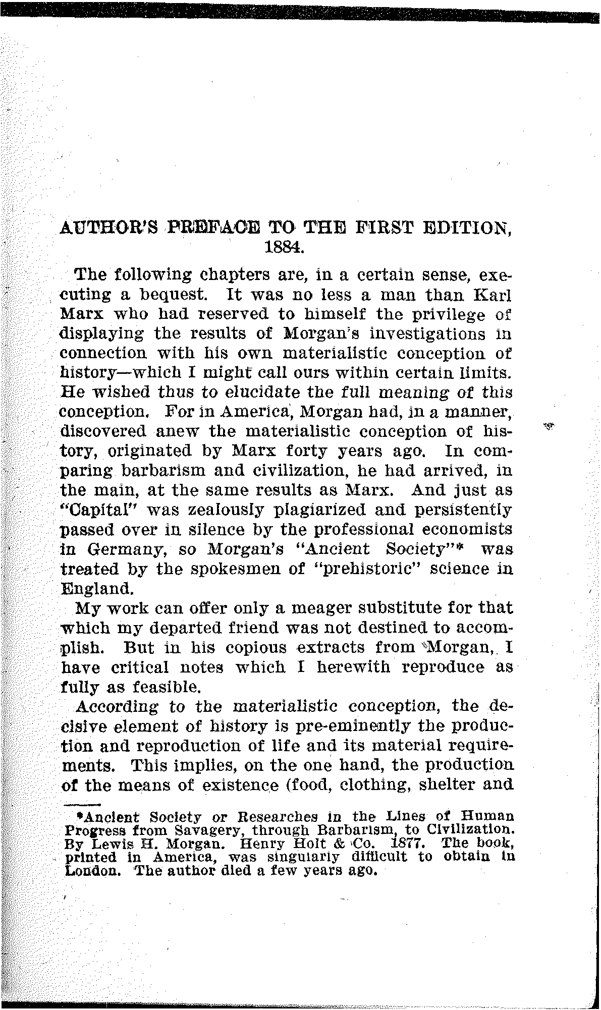 The following chapters are, in a certain sense, executing a bequest. It was no less a man than Karl Marx who had reserved to himself the privilege of displaying the results of Morgan's investigations in connection with his own materialistic conception of history—which I might call ours within certain limits. He wished thus to elucidate the full meaning of this conception. For in America, Morgan had, in a manner, discovered anew the materialistic conception of history, originated by Marx forty years ago. In comparing barbarism and civilization, he had arrived, in the main, at the same results as Marx. And just as "Capital" was zealously plagiarized and persistently passed over in silence by the professional economists in Germany, so Morgan's "Ancient Society"[1] was treated by the spokesmen of "prehistoric" science in England.