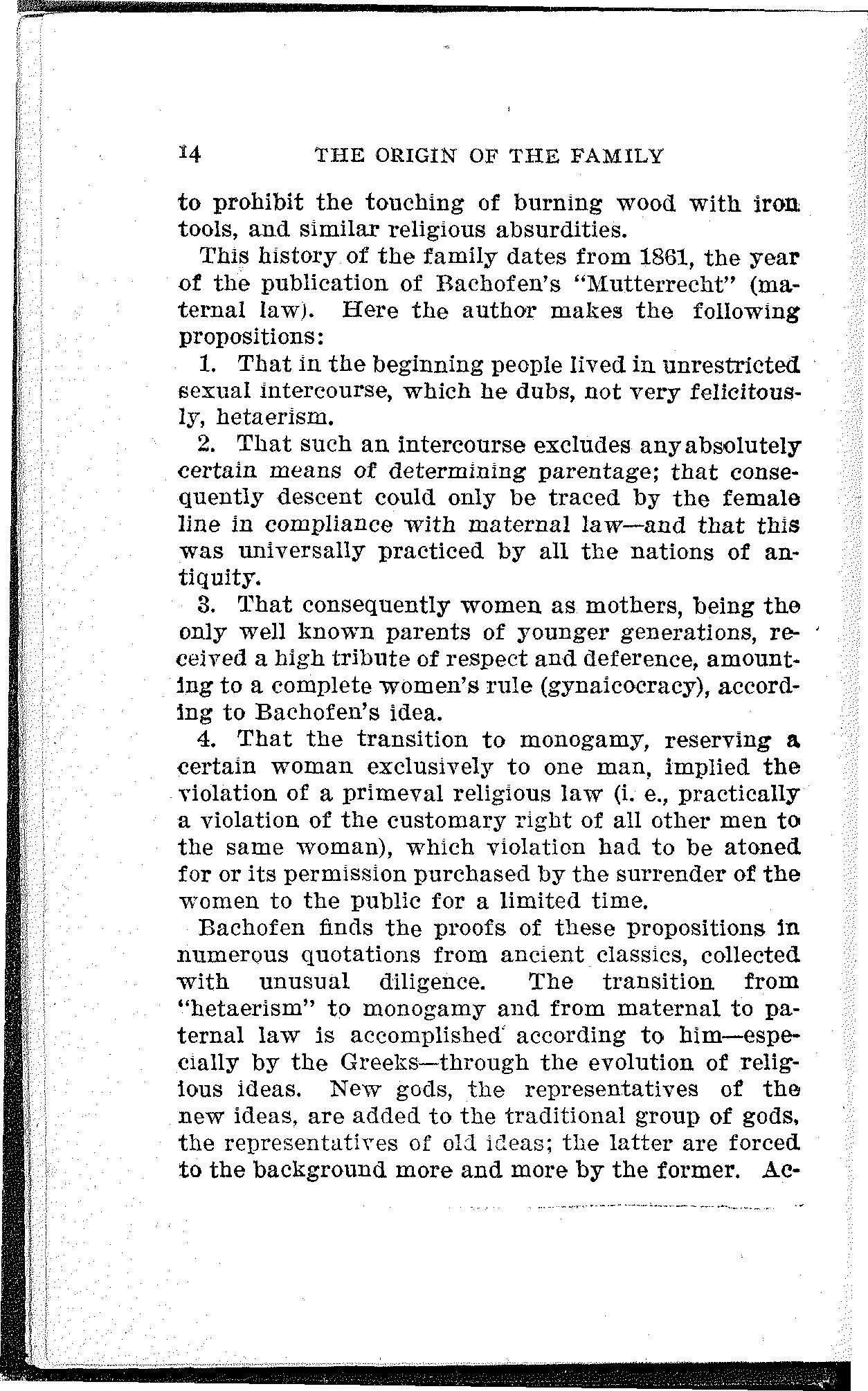 This history of the family dates from 1861, the year of the publication of Bachofen's "Mutterrecht" (maternal law). Here the author makes the following propositions: