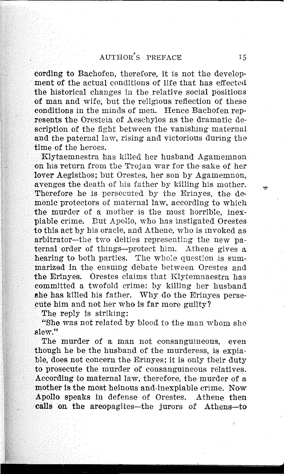 Bachofen finds the proofs of these propositions in numerous quotations from ancient classics, collected with unusual diligence. The transition from "hetaerism" to monogamy and from maternal to paternal law is accomplished according to him—especially by the Greeks—through the evolution of religious ideas. New gods, the representatives of the new ideas, are added to the traditional group of gods, the representatives of old ideas; the latter are forced to the background more and more by the former. [15]According to Bachofen, therefore, it is not the development of the actual conditions of life that has effected the historical changes in the relative social positions of man and wife, but the religious reflection of these conditions in the minds of men. Hence Bachofen represents the Oresteia of Aeschylos as the dramatic description of the fight between the vanishing maternal and the paternal law, rising and victorious during the time of the heroes.