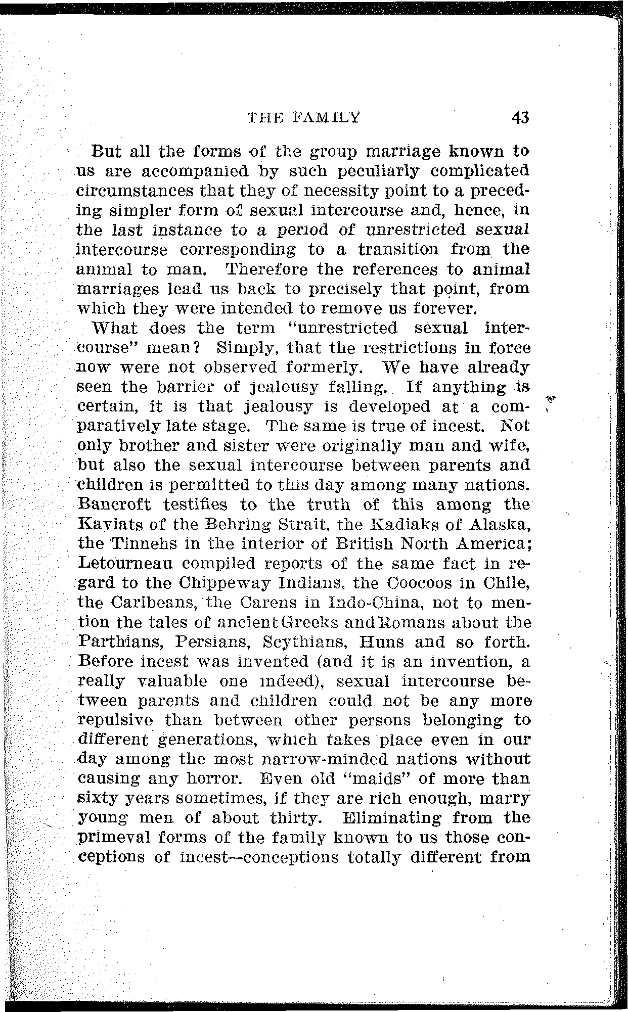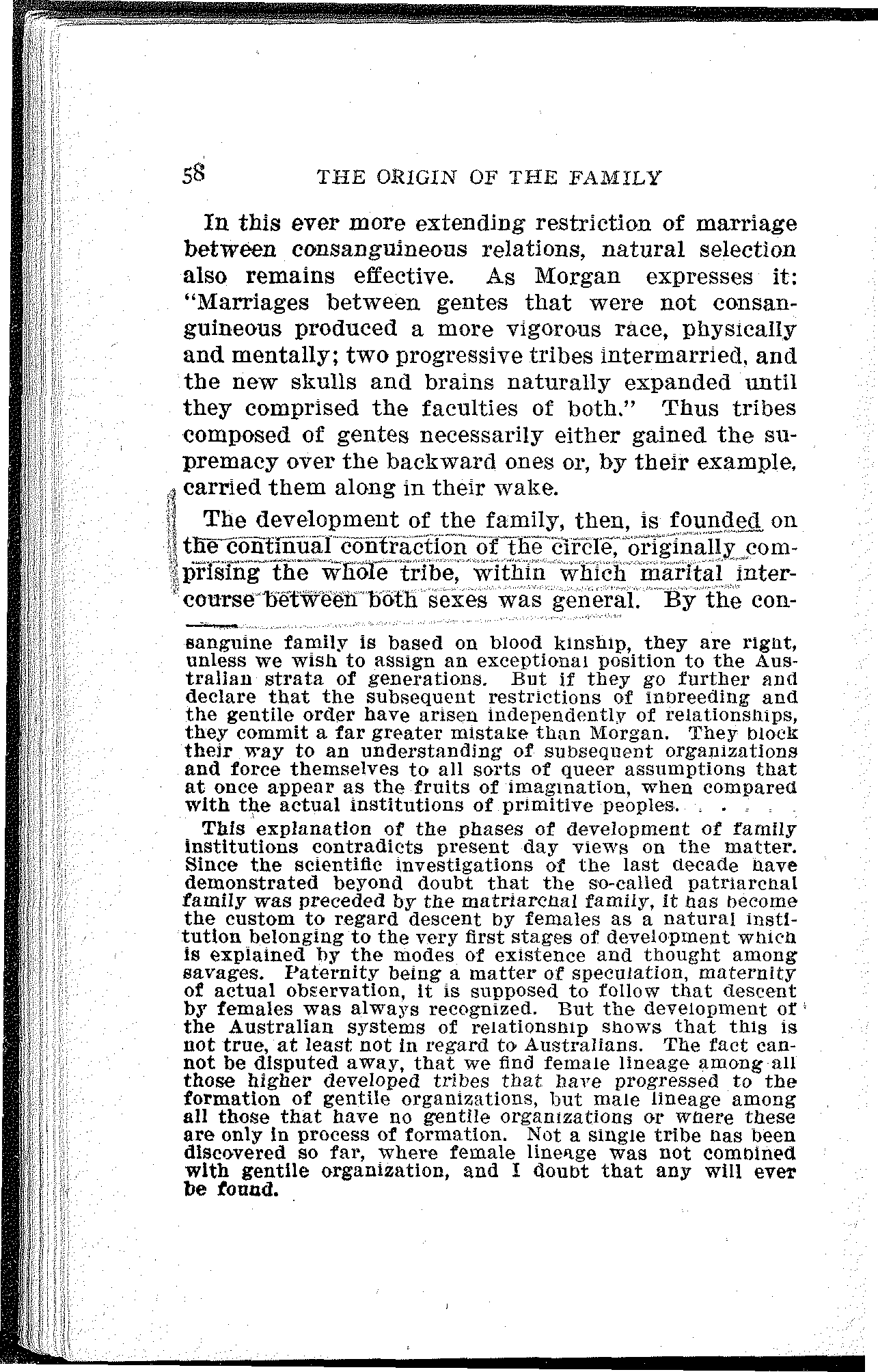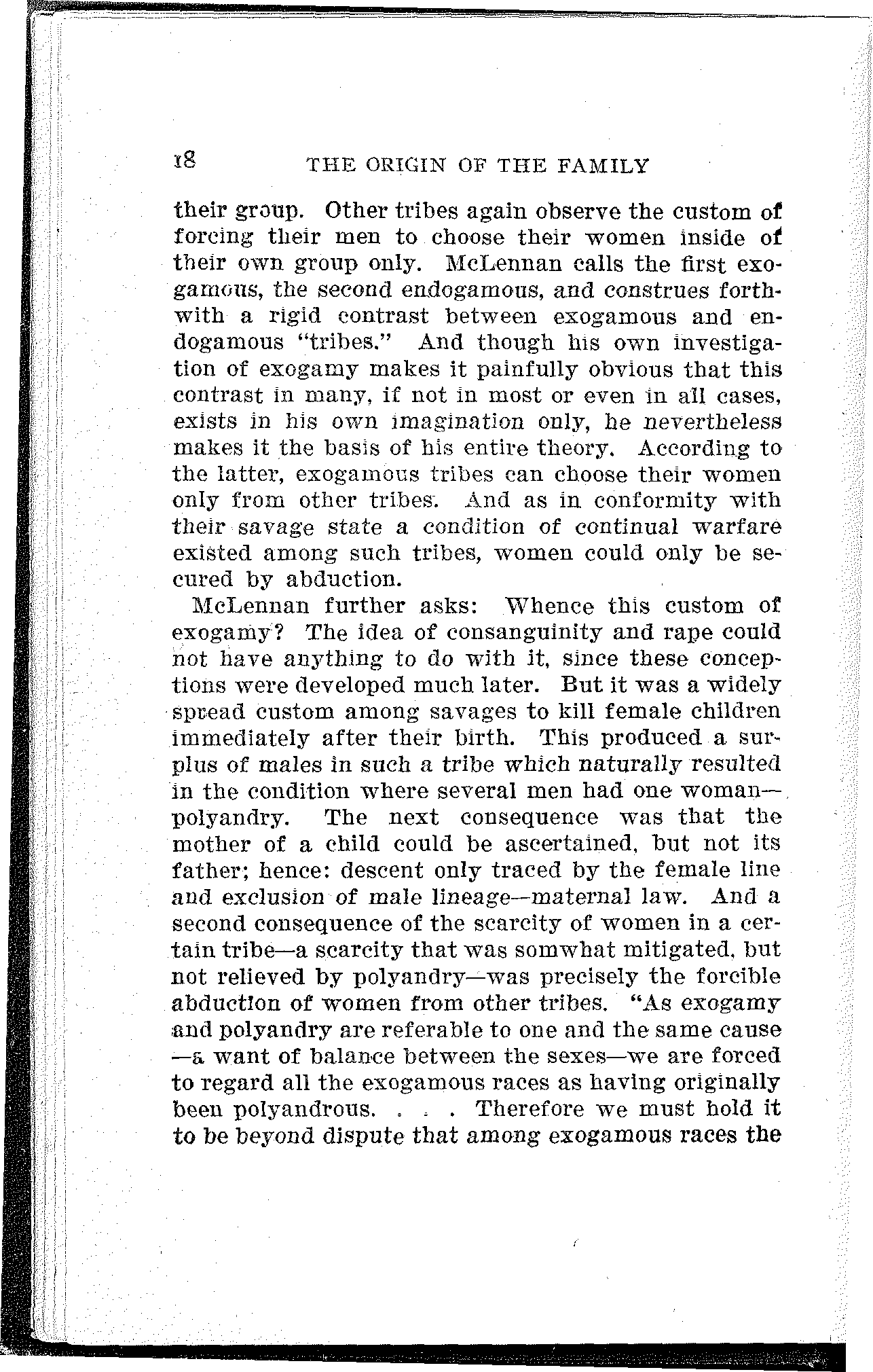 McLennan further asks: Whence this custom of exogamy? The idea of consanguinity and rape could not have anything to do with it, since these conceptions were developed much later. But it was a widely spread custom among savages to kill female children immediately after their birth. This produced a surplus of males in such a tribe which naturally resulted in the condition where several men had one woman—polyandry. The next consequence was that the mother of a child could be ascertained, but not its father; hence: descent only traced by the female line and exclusion of male lineage—maternal law. And a second consequence of the scarcity of women in a certain tribe—a scarcity that was somewhat mitigated, but not relieved by polyandry—was precisely the forcible abduction of women from other tribes. "As exogamy and polyandry are referable to one and the same cause—a want of balance between the sexes—we are forced to regard all the exogamous races as having originally been polyandrous.... Therefore we must hold it to be beyond dispute that among exogamous races the[19] first system of kinship was that which recognized blood-ties through mothers only."[2]