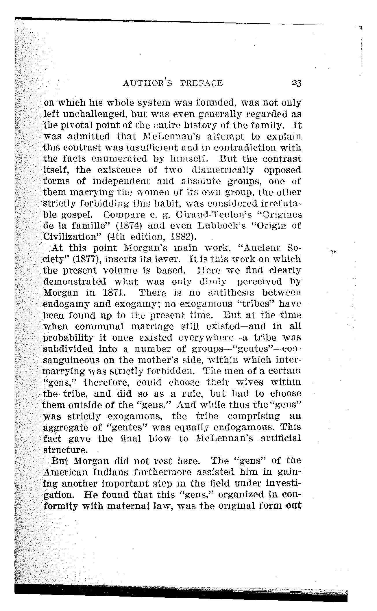 At this point Morgan's main work, "Ancient Society" (1877), inserts its lever. It is this work on which the present volume is based. Here we find clearly demonstrated what was only dimly perceived by Morgan in 1871. There is no antithesis between endogamy and exogamy; no exogamous "tribes" have been found up to the present time. But at the time when communal marriage still existed—and in all probability it once existed everywhere—a tribe was subdivided into a number of groups—"gentes"—consanguineous on the mother's side, within which intermarrying was strictly forbidden. The men of a certain "gens," therefore, could choose their wives within the tribe, and did so as a rule, but had to choose them outside of the "gens." And while thus the "gens" was strictly exogamous, the tribe comprising an aggregate of "gentes" was equally endogamous. This fact gave the final blow to McLennan's artificial structure.