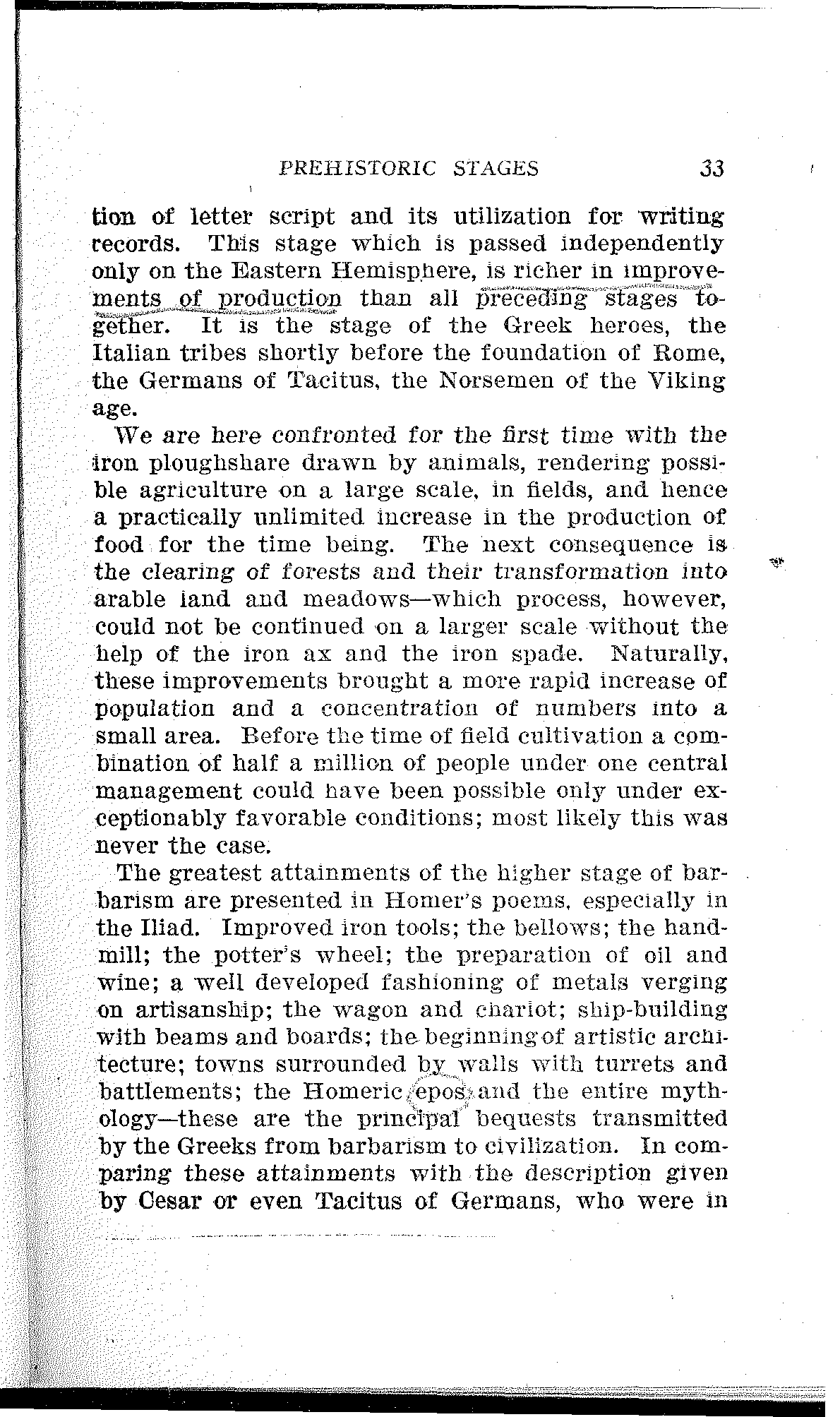 The next step brings us to the upper stage of barbarism, that period in which all nations of civilization go through their heroic era. It is the time of the iron sword, but also of the iron plow share and axe. The iron had become the servant of man. It is the last and most important of all raw products that play a revolutionary role in history; the last—if we except the potato.