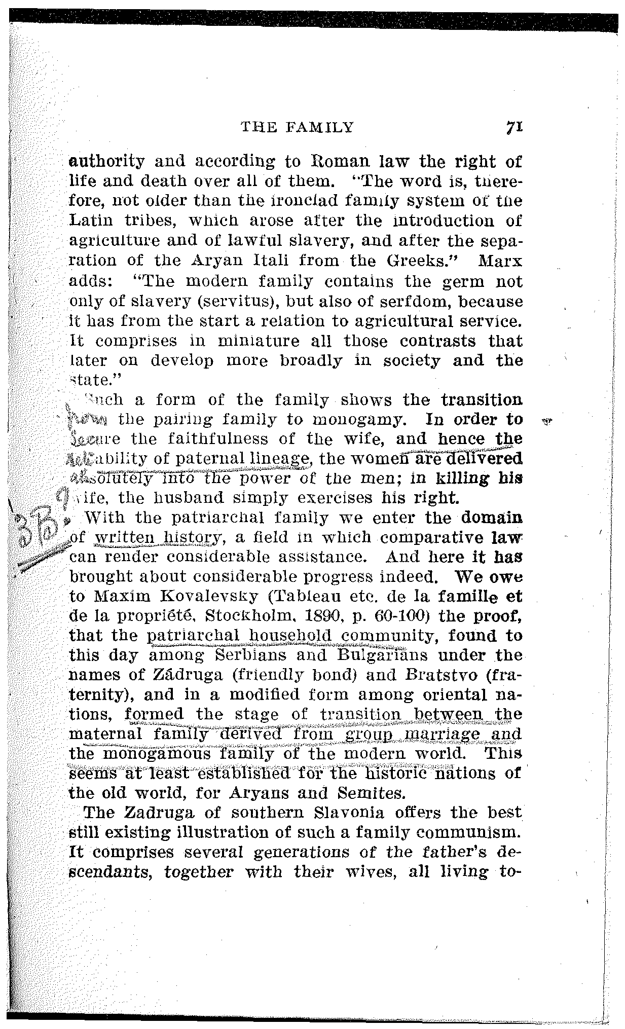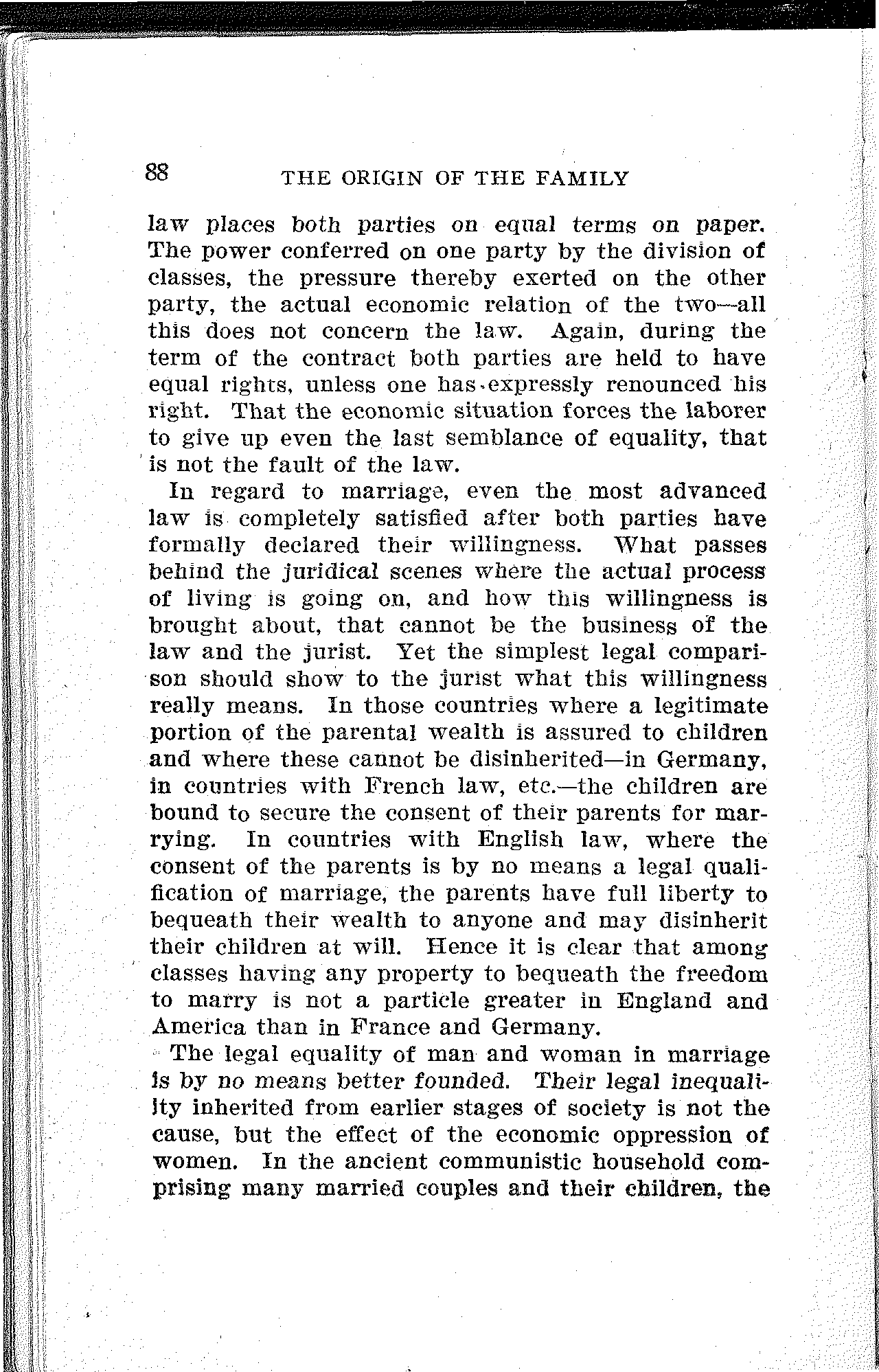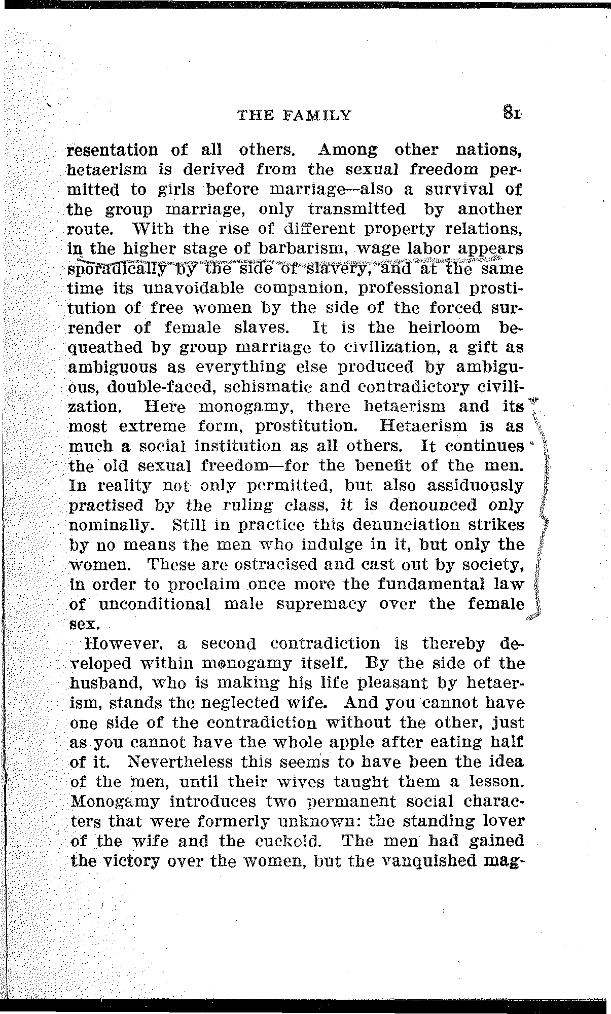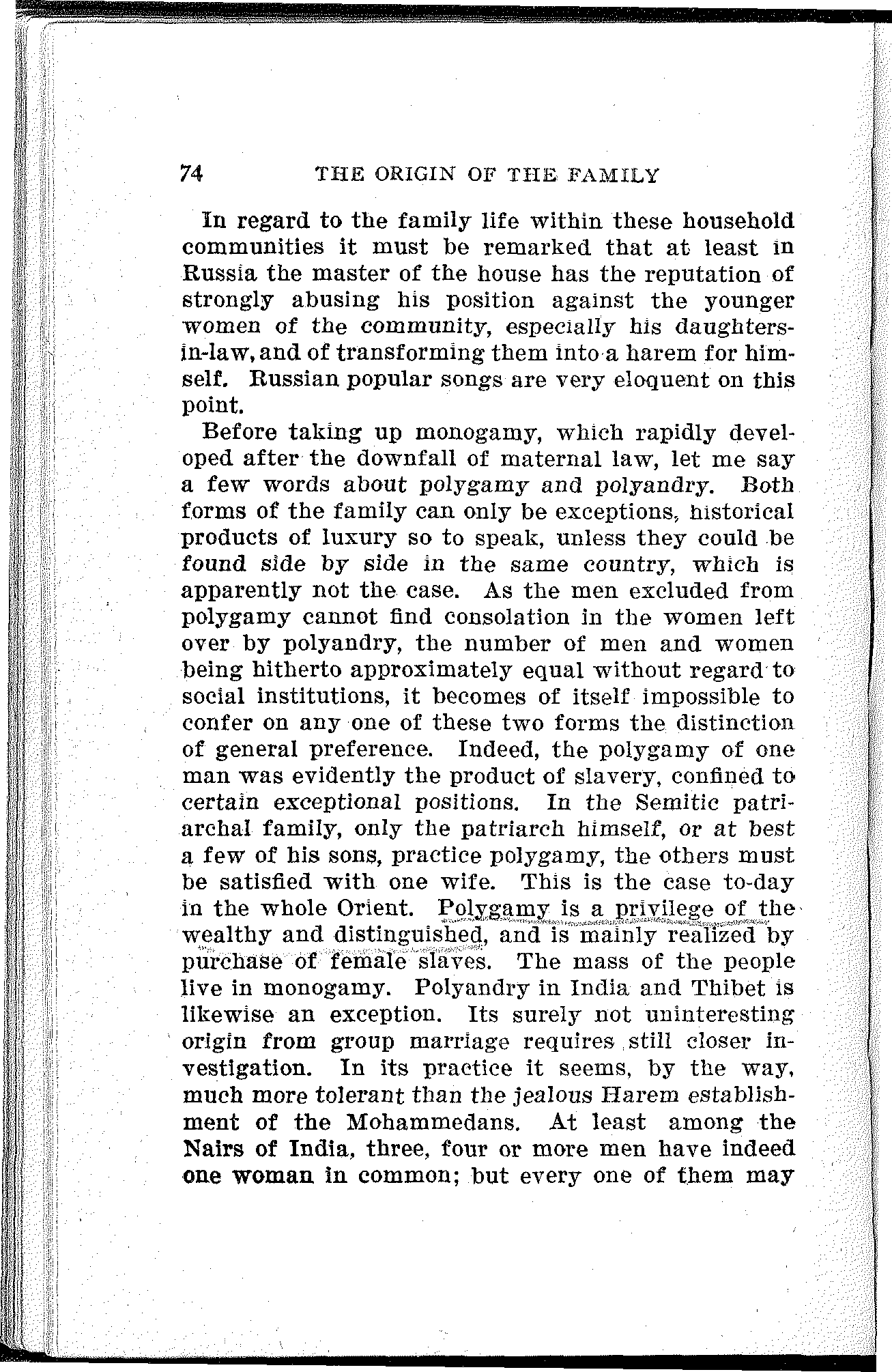 Yet Morgan held that "several thousand years have passed away without the overthrow of the privileged classes, excepting in the United States." But in the days of the trusts, of government by injunction, of sets of 400 with all the arrogance and exclusiveness of European nobility, of aristocratic branches of the Daughters of the Revolution, and other gifts of capitalist development, the modern American workingman will hardly share Morgan's optimistic view that there are no privileged classes in the United States. It must be admitted, however, that to this day Morgan's work is the most fundamental and exhaustive of[7] any written on the subject of ancient social development. Westermarck's "History of Human Marriage" treats the question mainly from the standpoint of Ethnology and Natural History. As a scientific treatise it is entirely inadequate, being simply a compilation of data from all parts of the world, arranged without the understanding of gentile organizations or of the materialistic conception of history, and used for wild speculations. Kovalevsky's argument turns on the proposition that the patriarchal household is a typical stage of society, intermediate between the matriarchal and monogamic family.