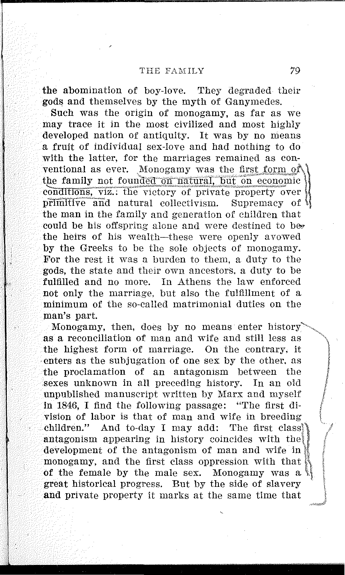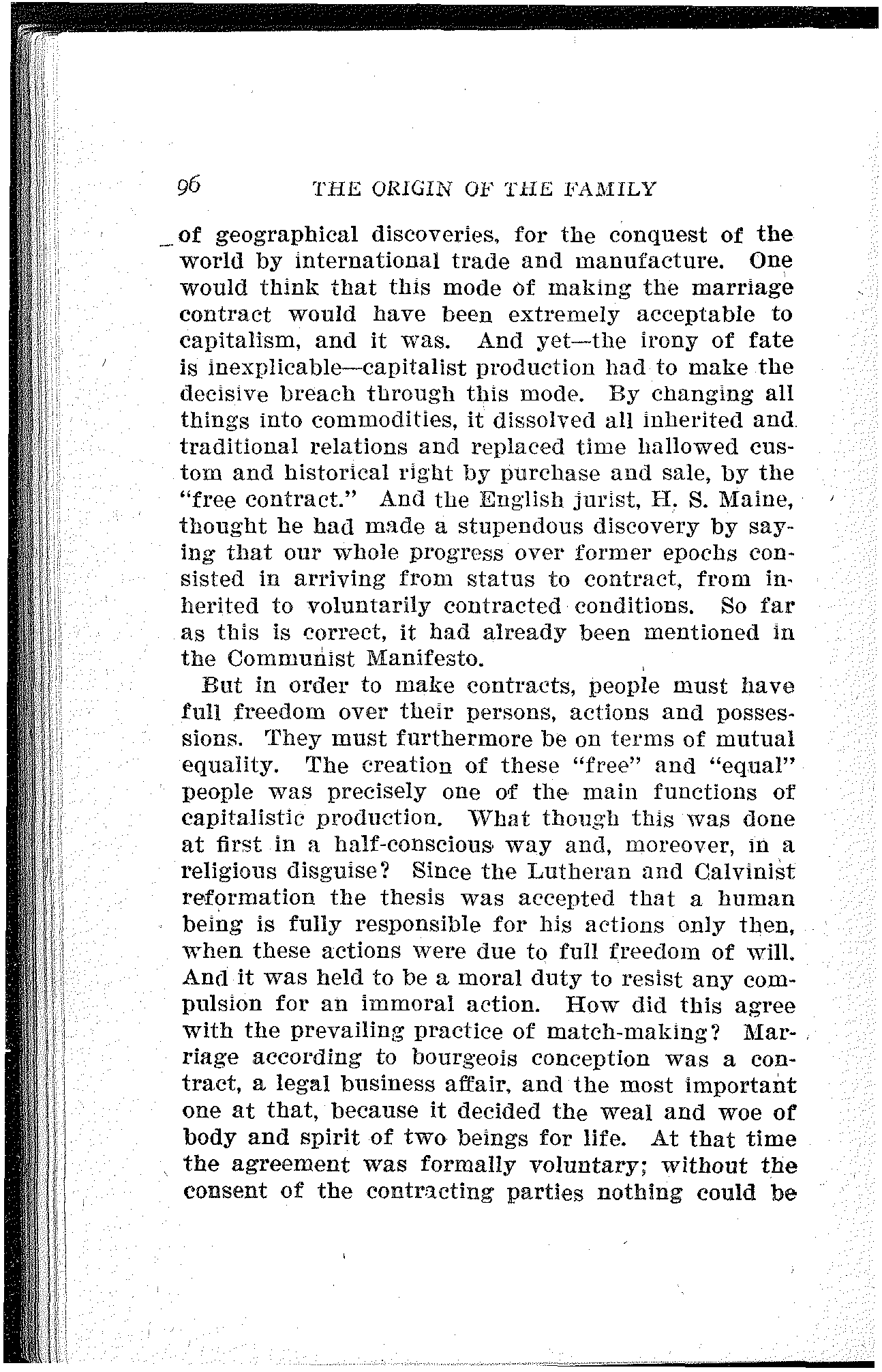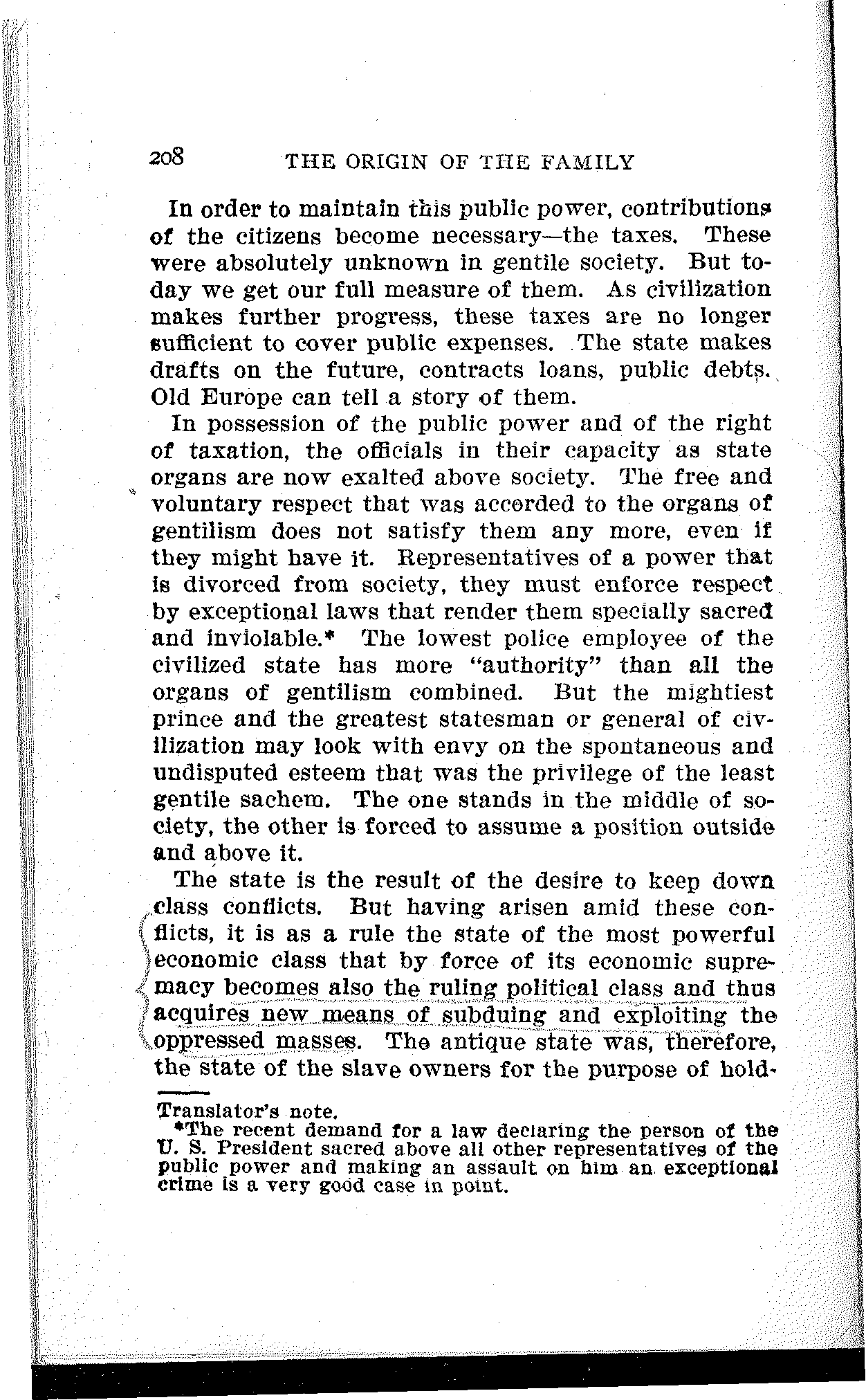 My work has been translated into different languages. First into Italian; L'origine della famiglia, della proprietá privata e dello stato, versione riveduta dall' autore, di Pasquale Martignetti; Benevento, 1885.[13] Then into Roumanian: Origina familei, proprietatei private si a statului, traducere de Ivan Nadejde, in the Jassy periodical "Contemporanul," September, 1885, to May, 1886. Furthermore into Danish: Familjens, Privatejendommens og Statens Oprindelse, Dansk, af Forfatteren gennemgaaet Udgave, besörget af Gerson Trier, Kjoebenhavn, 1888. A French translation by Henri Ravé, founded on the present German edition, is under the press.