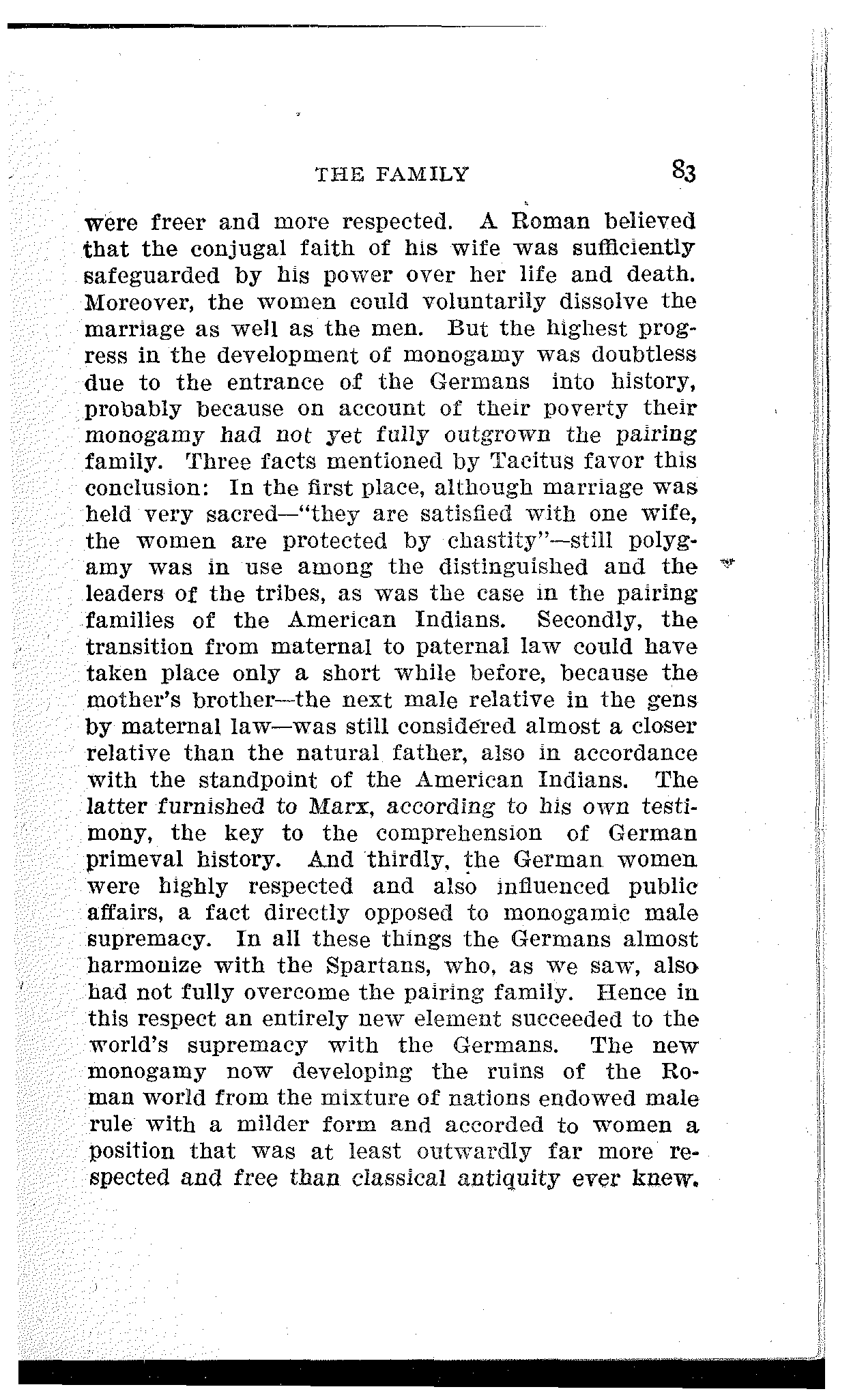 If they transformed the antique form of monogamy, mitigated the male rule in the family and gave a higher position to women than the classic world had ever known, what enabled them to do so, unless it was their barbarism, their gentile customs, their living inheritance of the time of maternal law?