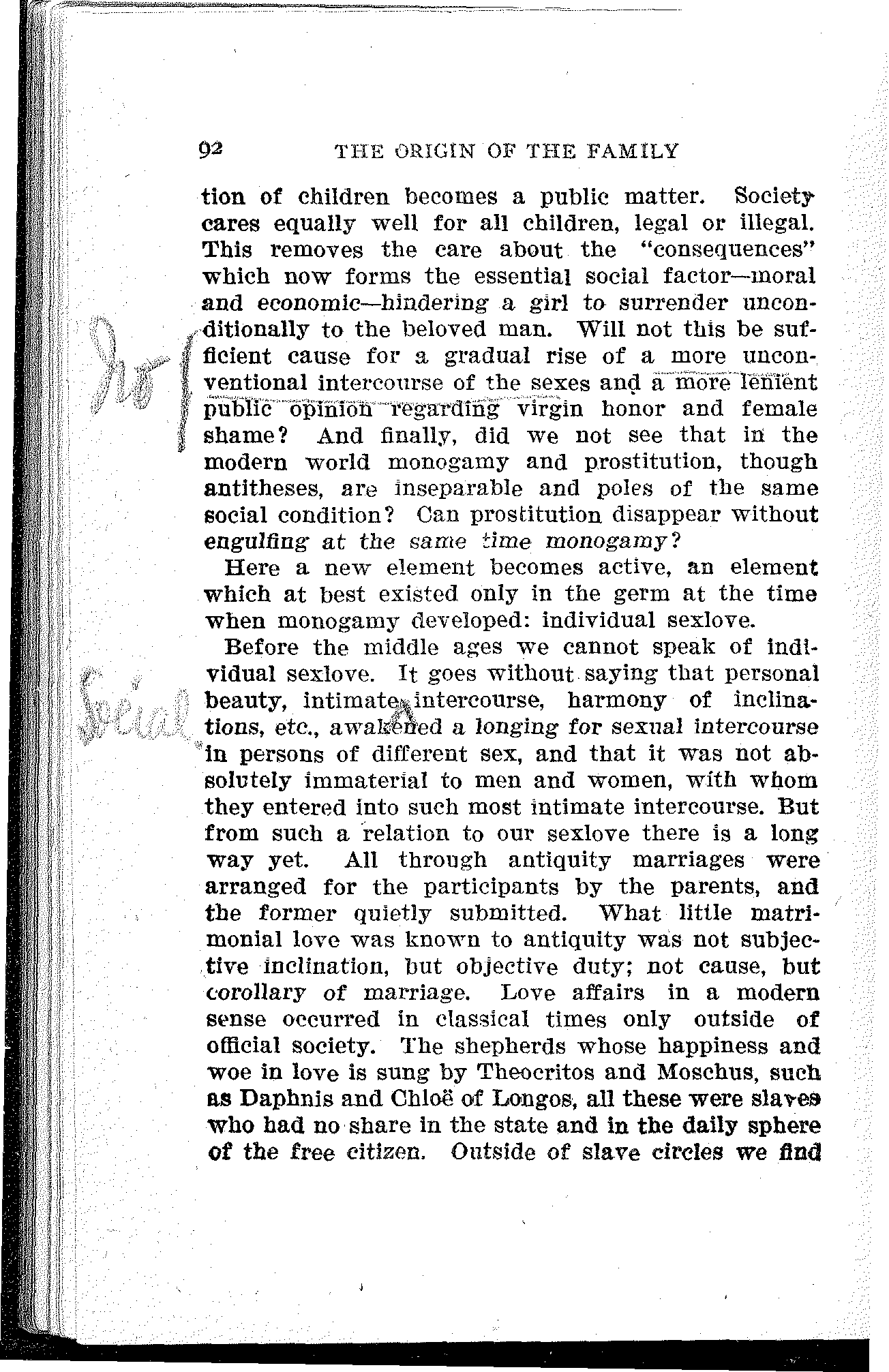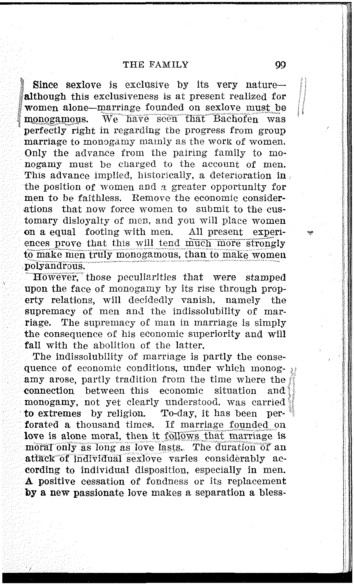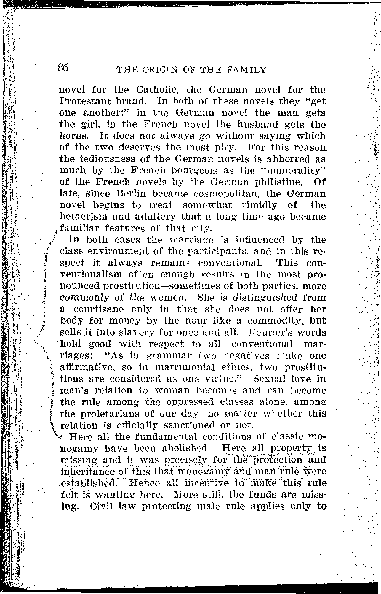 None of these men could discuss the matter from the proletarian point of view. For in order to do this, it is necessary to descend from the hills of class assumption into the valley of proletarian class-consciousness. This consciousness and the socialist mind are born together. The key to the philosophy of capitalism is the philosophy of socialism. With the rays of this searchlight, Engels exposed the pious "deceivers," property and the state, and their "lofty" ideal, covetousness. And the monogamic family, so far from being a divinely instituted "union of souls," is seen to be the product of a series of material and, in the last analysis, of the most sordid motives. But the ethics of property are worthy of a system of production that, in its final stage, shuts the overwhelming mass of longing humanity out from the happiness of home and family life, from all evolution to a higher individuality, and even drives progress back and forces millions of human beings into irrevocable degeneration.