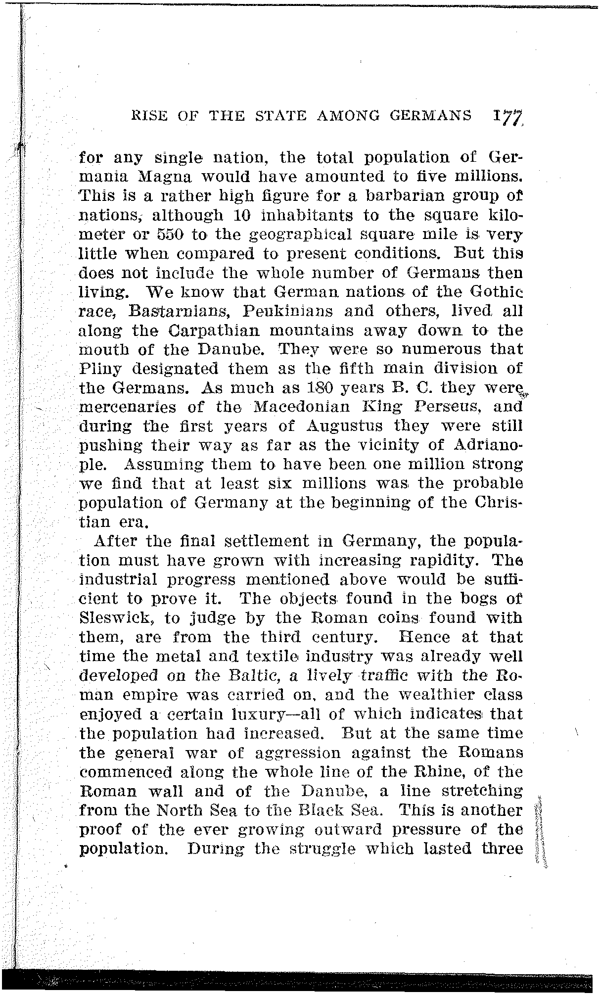 According to Tacitus the German nation was very strong in numbers. An approximate idea of the strength of individual German nations is given by Caesar. He states that the number of Usipetans and Tencterans who crossed over to the left bank of the Rhine amounted to 180,000, including women and children. About 100,000[30] members to a single nation is considerably more than e. g. the Iroquois numbered in their prime, when 20,000 of them became the terror of the whole country, from the Great Lakes to the Ohio and Potomac. If we attempt to place the better known nations of the Rhine country by the help of historical reports, we find that a single nation occupies on the map the average area of a Prussian government district, about 10,000 square kilometers[31] or 182 German geographical square miles.[32] The Germania Magna of the Romans, reaching to the Vistula, comprised about 500,000 square kilometers. Counting an average of 100,000[177] for any single nation, the total population of Germania Magna would have amounted to five millions. This is a rather high figure for a barbarian group of nations, although 10 inhabitants to the square kilometer or 550 to the geographical square mile is very little when compared to present conditions. But this does not include the whole number of Germans then living. We know that German nations of the Gothic race, Bastarnians, Peukinians and others, lived all along the Carpathian mountains away down to the mouth of the Danube. They were so numerous that Pliny designated them as the fifth main division of the Germans. As much as 180 years B. C. they were mercenaries of the Macedonian King Perseus, and during the first years of Augustus they were still pushing their way as far as the vicinity of Adrianople. Assuming them to have been one million strong we find that at least six millions was the probable population of Germany at the beginning of the Christian era.