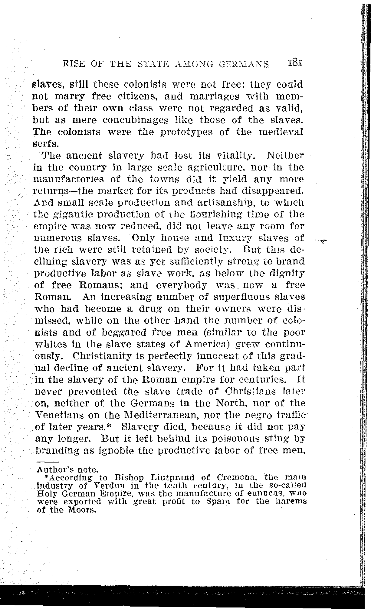 The ancient slavery had lost its vitality. Neither in the country in large scale agriculture, nor in the manufactories of the towns did it yield any more returns—the market for its products had disappeared. And small scale production and artisanship, to which the gigantic production of the flourishing time of the empire was now reduced, did not leave any room for numerous slaves. Only house and luxury slaves of the rich were still retained by society. But this declining slavery was as yet sufficiently strong to brand productive labor as slave work, as below the dignity of free Romans; and everybody was now a free Roman. An increasing number of superfluous slaves who had become a drug on their owners were dismissed, while on the other hand the number of colonists and of beggared free men (similar to the poor whites in the slave states of America) grew continuously. Christianity is perfectly innocent of this gradual decline of ancient slavery. For it had taken part in the slavery of the Roman empire for centuries. It never prevented the slave trade of Christians later on, neither of the Germans in the North, nor of the Venetians on the Mediterranean, nor the negro traffic of later years.[34] Slavery died, because it did not pay any longer. But it left behind its poisonous sting by branding as ignoble the productive labor of free men.[182] This brought the Roman world into a closed alley from which it could not escape. Slave labor was economically impossible and the labor of free men was under a moral ban. The one could exist no longer, the other could not yet be the fundamental form of social production. There was no other help but a complete revolution.