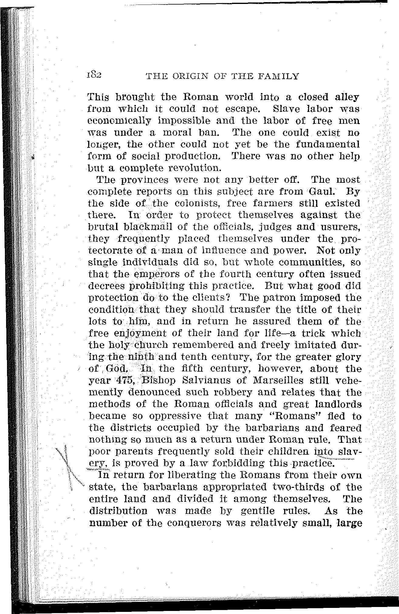 The provinces were not any better off. The most complete reports on this subject are from Gaul. By the side of the colonists, free farmers still existed there. In order to protect themselves against the brutal blackmail of the officials, judges and usurers, they frequently placed themselves under the protectorate of a man of influence and power. Not only single individuals did so, but whole communities, so that the emperors of the fourth century often issued decrees prohibiting this practice. But what good did protection do to the clients? The patron imposed the condition that they should transfer the title of their lots to him, and in return he assured them of the free enjoyment of their land for life—a trick which the holy church remembered and freely imitated during the ninth and tenth century, for the greater glory of God. In the fifth century, however, about the year 475, Bishop Salvianus of Marseilles still vehemently denounced such robbery and relates that the methods of the Roman officials and great landlords became so oppressive that many "Romans" fled to the districts occupied by the barbarians and feared nothing so much as a return under Roman rule. That poor parents frequently sold their children into slavery, is proved by a law forbidding this practice.