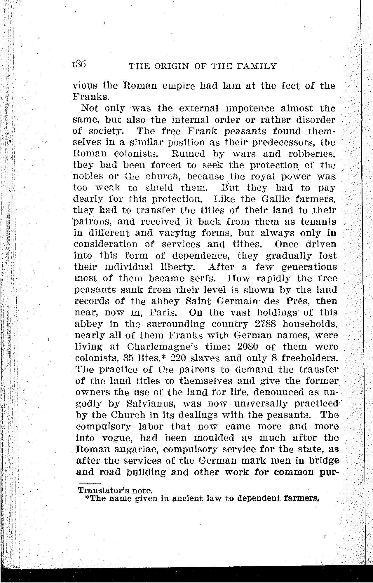 Not only was the external impotence almost the same, but also the internal order or rather disorder of society. The free Frank peasants found themselves in a similar position as their predecessors, the Roman colonists. Ruined by wars and robberies, they had been forced to seek the protection of the nobles or the church, because the royal power was too weak to shield them. But they had to pay dearly for this protection. Like the Gallic farmers, they had to transfer the titles of their land to their patrons, and received it back from them as tenants in different and varying forms, but always only in consideration of services and tithes. Once driven into this form of dependence, they gradually lost their individual liberty. After a few generations most of them became serfs. How rapidly the free peasants sank from their level is shown by the land records of the abbey Saint Germain des Prés, then near, now in, Paris. On the vast holdings of this abbey in the surrounding country 2788 households, nearly all of them Franks with German names, were living at Charlemagne's time; 2080 of them were colonists, 35 lites,[36] 220 slaves and only 8 freeholders. The practice of the patrons to demand the transfer of the land titles to themselves and give the former owners the use of the land for life, denounced as ungodly by Salvianus, was now universally practiced by the Church in its dealings with the peasants. The compulsory labor that now came more and more into vogue, had been moulded as much after the Roman angariae, compulsory service for the state, as after the services of the German mark men in bridge and road building and other work for common [187]purposes. By all appearances, then, the mass of the population had arrived at the same old goal after four hundred years.