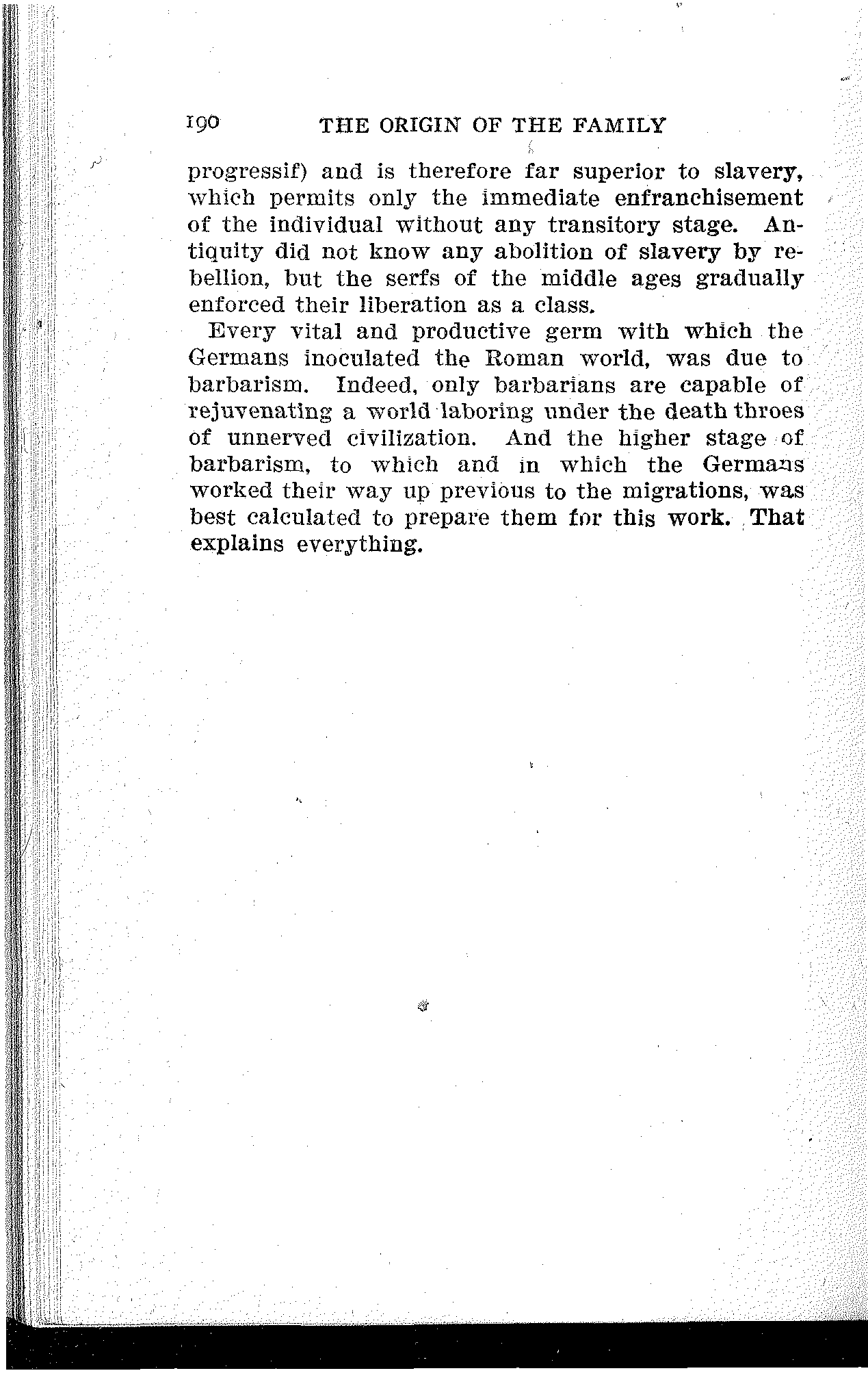 Every vital and productive germ with which the Germans inoculated the Roman world, was due to barbarism. Indeed, only barbarians are capable of rejuvenating a world laboring under the death throes of unnerved civilization. And the higher stage of barbarism, to which and in which the Germans worked their way up previous to the migrations, was best calculated to prepare them for this work. That explains everything.