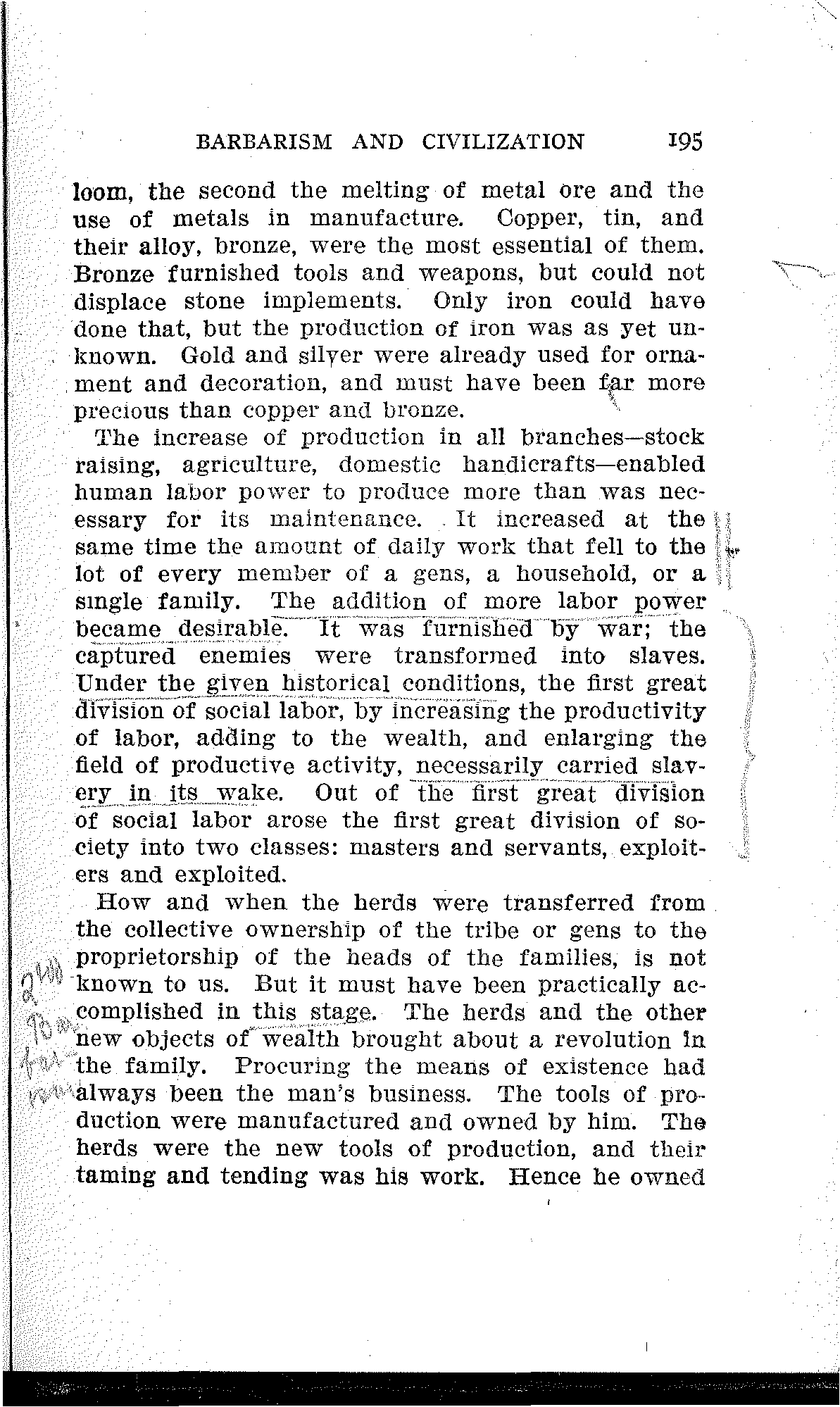 The increase of production in all branches—stock raising, agriculture, domestic handicrafts—enabled human labor power to produce more than was necessary for its maintenance. It increased at the same time the amount of daily work that fell to the lot of every member of a gens, a household, or a single family. The addition of more labor power became desirable. It was furnished by war; the captured enemies were transformed into slaves. Under the given historical conditions, the first great division of social labor, by increasing the productivity of labor, adding to the wealth, and enlarging the field of productive activity, necessarily carried slavery in its wake. Out of the first great division of social labor arose the first great division of society into two classes: masters and servants, exploiters and exploited.
