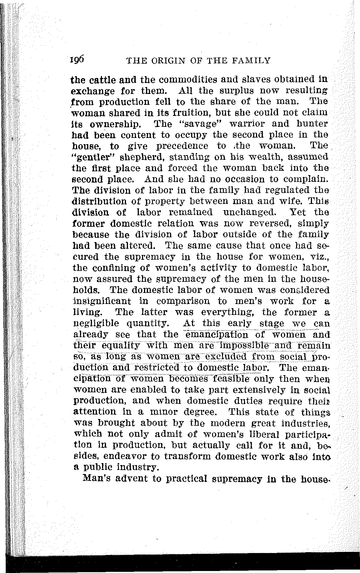 How and when the herds were transferred from the collective ownership of the tribe or gens to the proprietorship of the heads of the families, is not known to us. But it must have been practically accomplished in this stage. The herds and the other new objects of wealth brought about a revolution in the family. Procuring the means of existence had always been the man's business. The tools of production were manufactured and owned by him. The herds were the new tools of production, and their taming and tending was his work. Hence he owned[196] the cattle and the commodities and slaves obtained in exchange for them. All the surplus now resulting from production fell to the share of the man. The woman shared in its fruition, but she could not claim its ownership. The "savage" warrior and hunter had been content to occupy the second place in the house, to give precedence to the woman. The "gentler" shepherd, standing on his wealth, assumed the first place and forced the woman back into the second place. And she had no occasion to complain. The division of labor in the family had regulated the distribution of property between man and wife. This division of labor remained unchanged. Yet the former domestic relation was now reversed, simply because the division of labor outside of the family had been altered. The same cause that once had secured the supremacy in the house for women, viz., the confining of women's activity to domestic labor, now assured the supremacy of the men in the households. The domestic labor of women was considered insignificant in comparison to men's work for a living. The latter was everything, the former a negligible quantity. At this early stage we can already see that the emancipation of women and their equality with men are impossible and remain so, as long as women are excluded from social production and restricted to domestic labor. The emancipation of women becomes feasible only then when women are enabled to take part extensively in social production, and when domestic duties require their attention in a minor degree. This state of things was brought about by the modern great industries, which not only admit of women's liberal participation in production, but actually call for it and, besides, endeavor to transform domestic work also into a public industry.