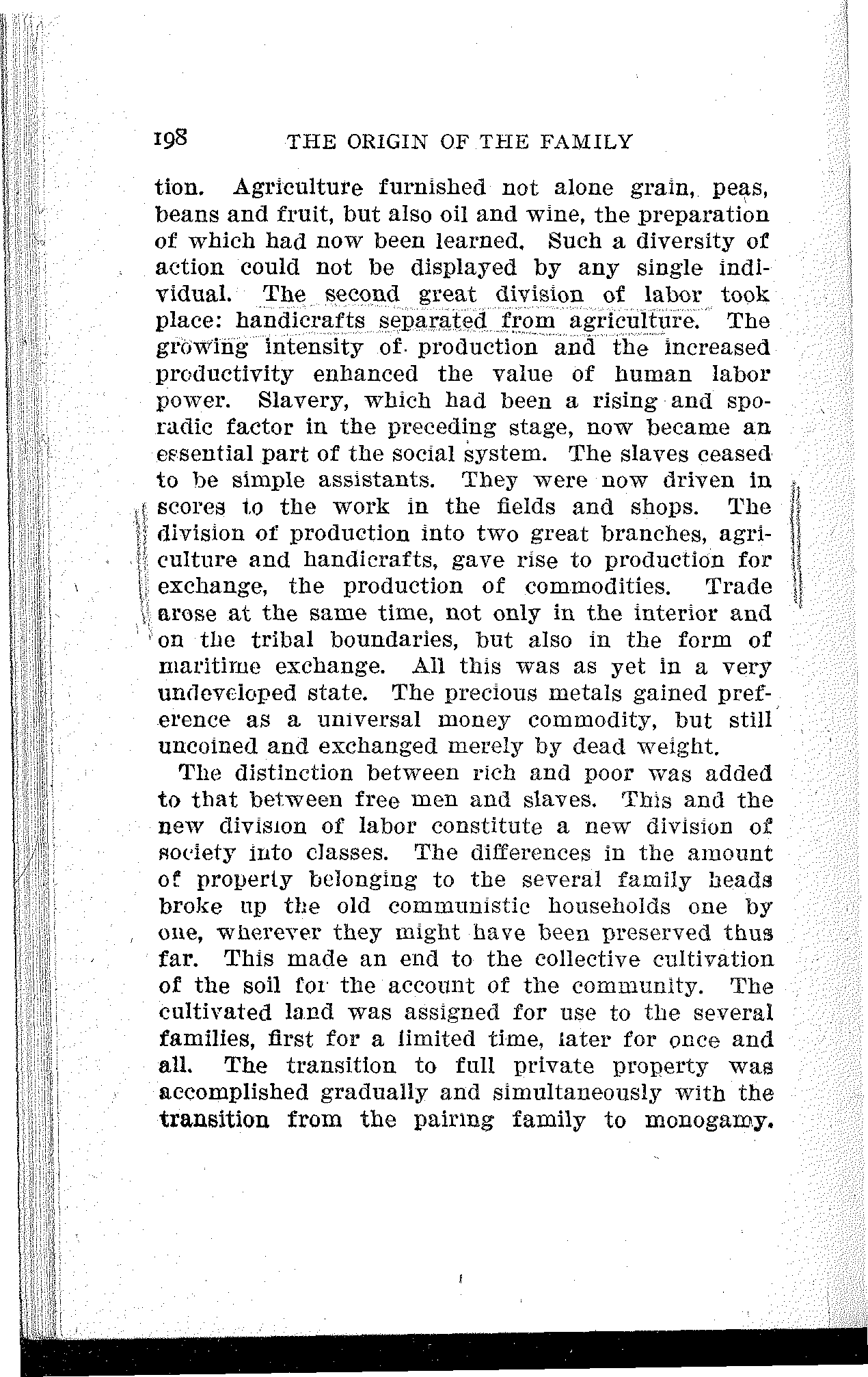 The distinction between rich and poor was added to that between free men and slaves. This and the new division of labor constitute a new division of society into classes. The differences in the amount of property belonging to the several family heads broke up the old communistic households one by one, wherever they might have been preserved thus far. This made an end to the collective cultivation of the soil for the account of the community. The cultivated land was assigned for use to the several families, first for a limited time, later for once and all. The transition to full private property was accomplished gradually and simultaneously with the transition from the pairing family to monogamy.[199] The monogamous family began to be the economic unit of society.