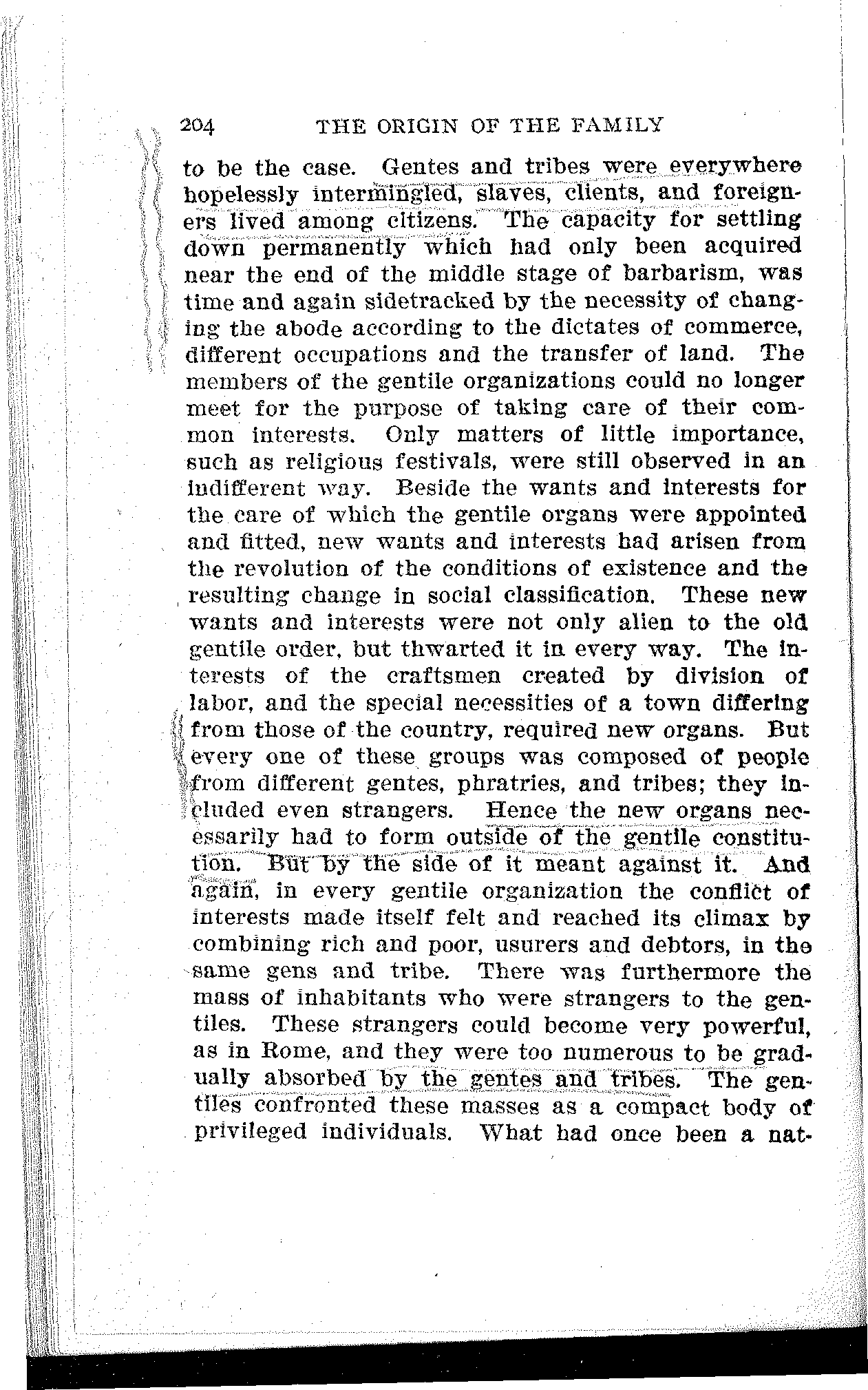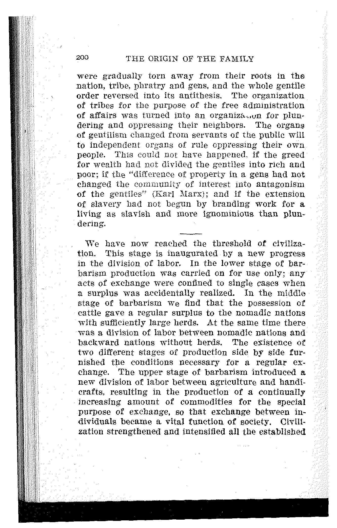 Having observed the dissolution of the gentile order in the three concrete cases of the Greek, Roman, and German nations, we may now investigate in conclusion the general economic conditions that began by undermining the gentile organization of society during the upper stage of barbarism and ended by doing away with it entirely at the advent of civilization. Marx's "Capital" will be as necessary for the successful completion of this task as Morgan's "Ancient Society."