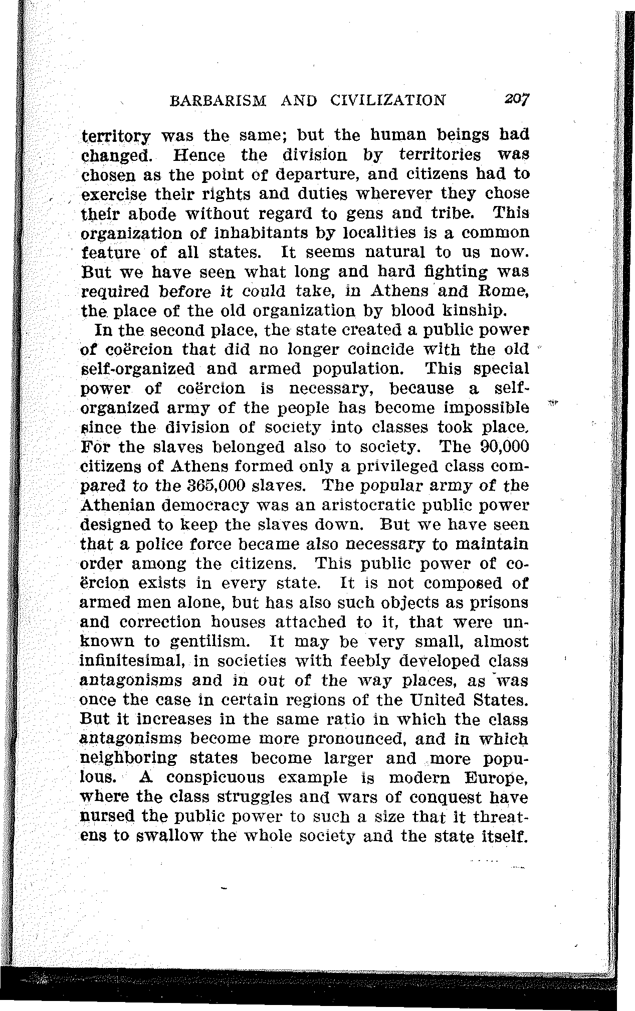 In the second place, the state created a public power of coërcion that did no longer coincide with the old self-organized and armed population. This special power of coërcion is necessary, because a self-organized army of the people has become impossible since the division of society into classes took place. For the slaves belonged also to society. The 90,000 citizens of Athens formed only a privileged class compared to the 365,000 slaves. The popular army of the Athenian democracy was an aristocratic public power designed to keep the slaves down. But we have seen that a police force became also necessary to maintain order among the citizens. This public power of coërcion exists in every state. It is not composed of armed men alone, but has also such objects as prisons and correction houses attached to it, that were unknown to gentilism. It may be very small, almost infinitesimal, in societies with feebly developed class antagonisms and in out of the way places, as was once the case in certain regions of the United States. But it increases in the same ratio in which the class antagonisms become more pronounced, and in which neighboring states become larger and more populous. A conspicuous example is modern Europe, where the class struggles and wars of conquest have nursed the public power to such a size that it threatens to swallow the whole society and the state itself.