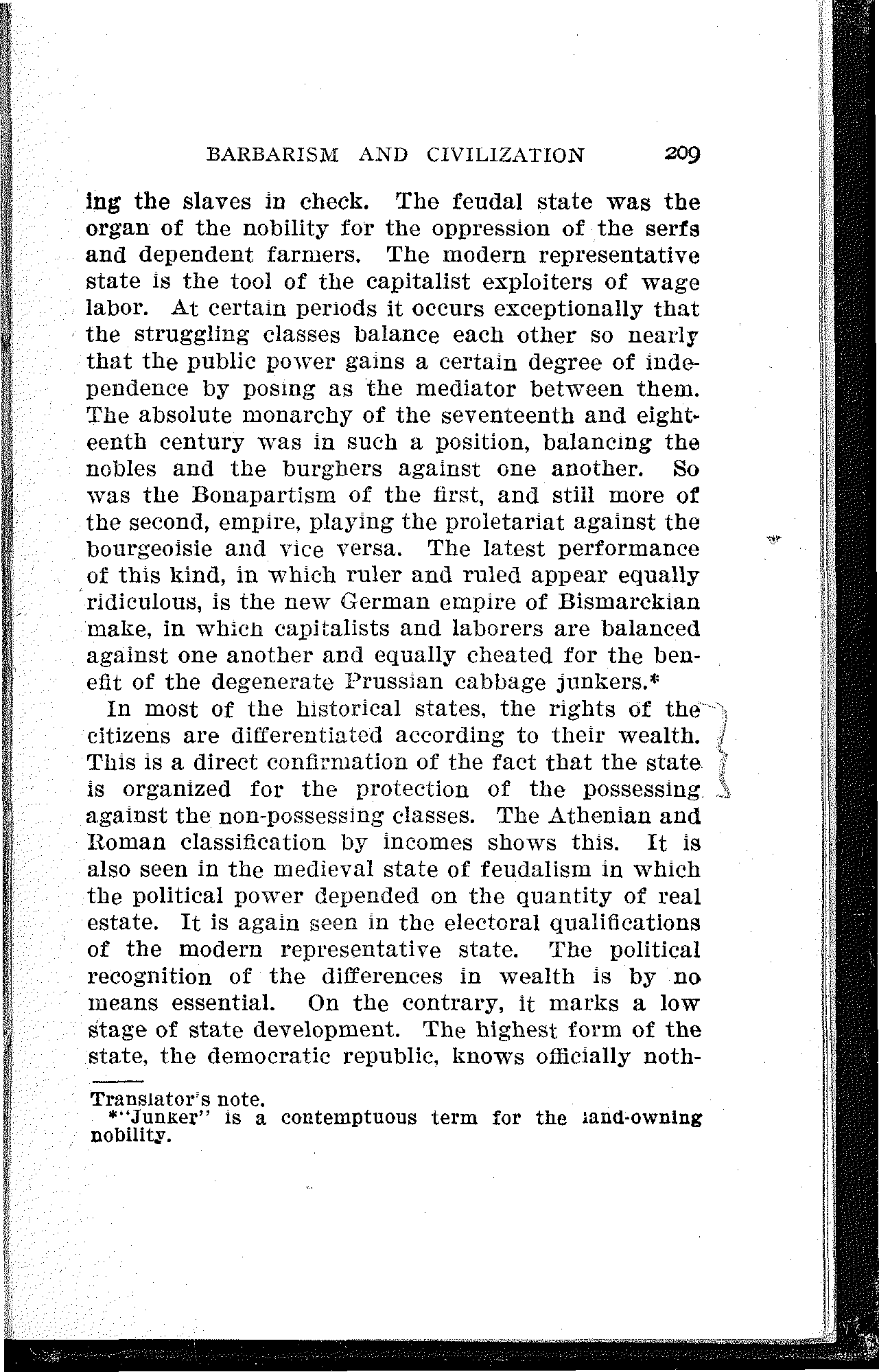 And in conclusion, if they could develop and universally introduce the mild form of servitude which they had been practicing at home, and which more and more displaced slavery also in the Roman empire—to whom was it due, unless it was again their barbarism, thanks to which they had not yet arrived at complete slavery, neither in the form of the ancient labor slaves, nor in that of the oriental house slaves?