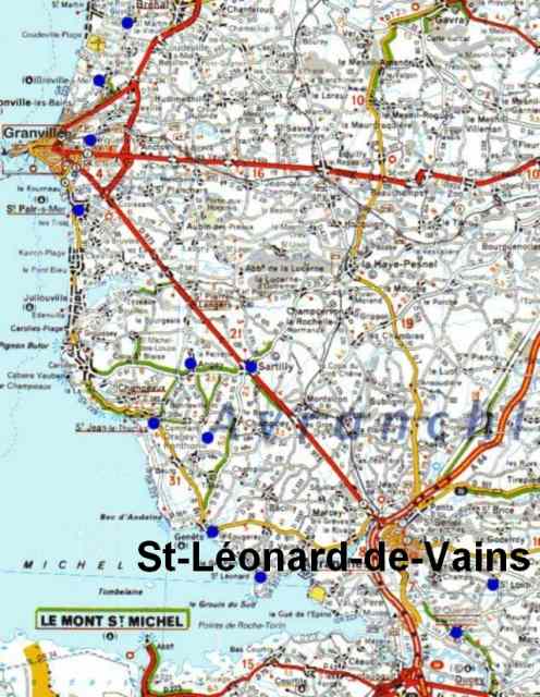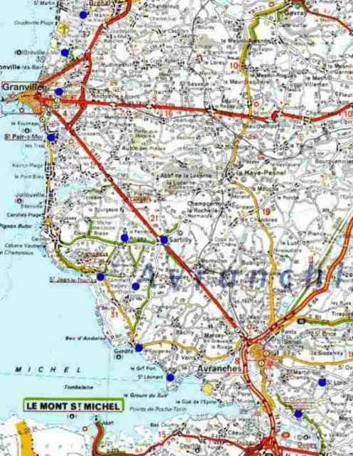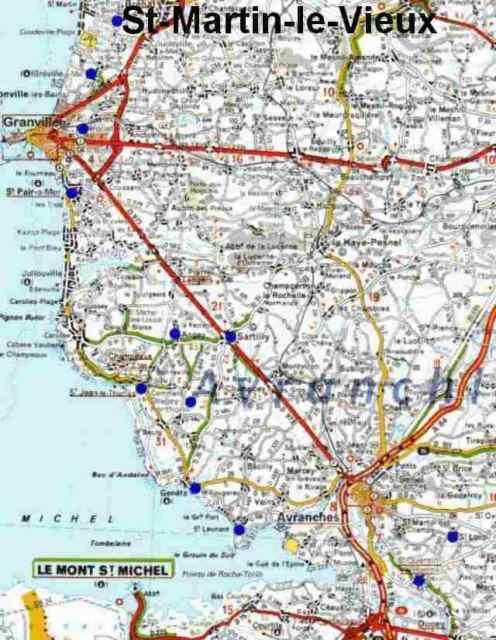 002. Southern Manche. The map of the region. From north to south, these blue spots show the churches of Saint-Martin-le-Vieux, Bréville, Yquelon, Saint-Pair-sur-Mer, Angey, Saint-Jean-le-Thomas, Dragey, Genêts, Saint-Léonard-de-Vains, Saint-Loup and Saint-Quentin-sur-le-Homme, without forgetting the beautiful Romanesque gate in Sartilly. This map was digitized by Georges Cercel.