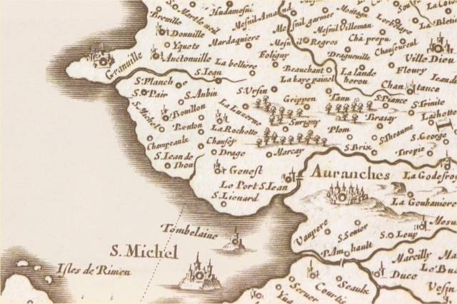 003. Southern Manche. An old map of the region. This region has belonged to Cotentin for its northern part and Avranchin for its southern part. The limit between Cotentin and Avranchin is the small river Thar, that flows into the Channel at the south of Granville. In the Middle Ages, this region was rich, with more people living on the coast than inside the land. The economic life was active, with fisheries, salines near Saint-Martin-de-Bréhal, Bréville and Saint-Léonard-de-Vains, pitch sand and kelp used as fertilizers, and a number of intensive cultures. This old map belongs to the collection of the city library in Granville. Photo by Claude Rayon. [Claude-02]