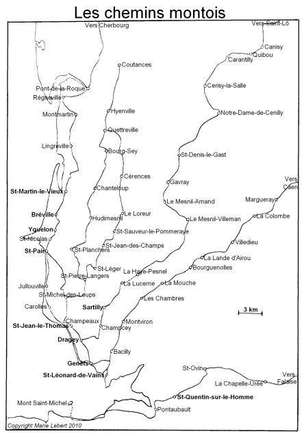 006. Southern Manche. The medieval roads going to Mont Saint-Michel. This region was crossed by several roads used by pilgrims to reach Mont Saint-Michel. At the north of Avranches, we had from west to east the shore road coming from Saint-Pair-sur-Mer, the road coming from Saint-Pair-sur-Mer (with a different route), the road coming from Coutances, the road coming from Saint-Lô, and the road coming from Caen. At the south of Avranches, a medieval road was used by the pilgrims coming from Tinchebray, Condé-sur-Noireau, Falaise or Lisieux to reach Mont Saint-Michel. Map by Marie Lebert.