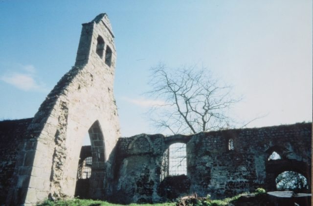 011. Saint-Martin-le-Vieux. The Romanesque ruins. Between the choir and the nave, a double belfry (double because intended for two bells) was added in the 16th century, and built in pink granite from Chausey (an island not far from Granville). Photo by Alain Dermigny. [Alain-003]