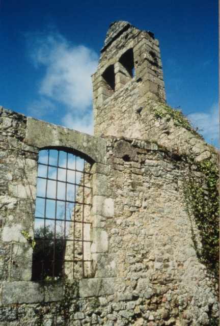 010. Saint-Martin-le-Vieux. The Romanesque ruins, with a double belfry added in the 16th century. The ruins were overgrown by vegetation for a while. The masonry is made of irregular blocks in schist and granite. The arches and abutments of the openings are in granite. The schist is the local stone. The granit could come from the granite ground of Vire a few miles south. Photo by Alain Dermigny. [Alain-002]