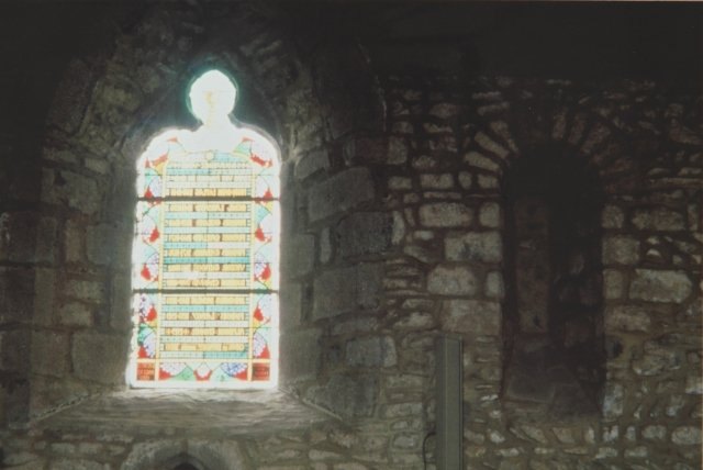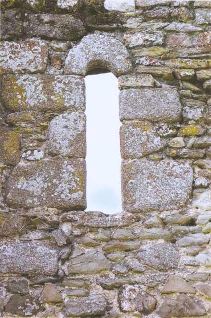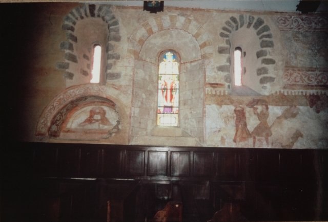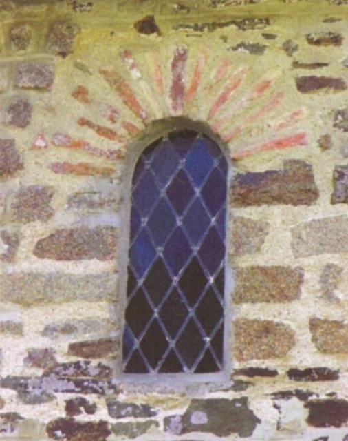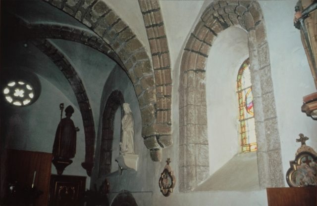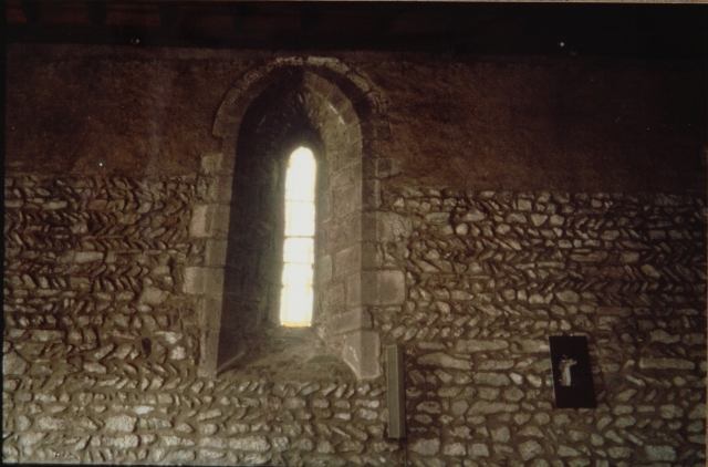 127. Dragey. The north wall of the nave (inside). The large trefoil bay is from the 13th century. A walled-up Romanesque bay with a deep splay is on the right, with an arch formed by a row of small granite quoins. This Romanesque bay is the only remaining original bay in the church. Photo by Alain Dermigny. [Alain-068]