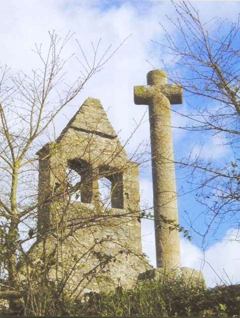 016. Saint-Martin-le-Vieux. Behind the old cross, the double belfry from the 16th century, built in granite from Chausey. Photo by Claude Rayon. [Claude-05]