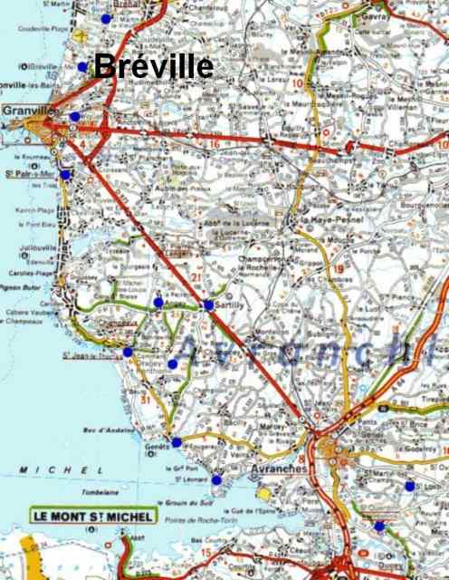 017. Bréville. Location. The village of Bréville is located on the coast, about 6 kilometers north of Granville. It was situated on a medieval road that came from Cherbourg to go to Saint-Pair-sur-Mer before reaching Mont Saint-Michel, the final destination for many pilgrims.
