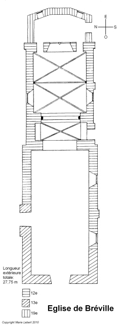 023. Bréville. The church plan. Regularly oriented from west to east, the rectangular building is formed by a two-row nave and a two-row choir with a flat apse. The whole building has an external length of 27,75 meters and an external width of 7,65 meters (width of the front). The tower rises between choir and nave. The small five-sided building in the extension of the choir houses the sacristy. Plan by Marie Lebert.