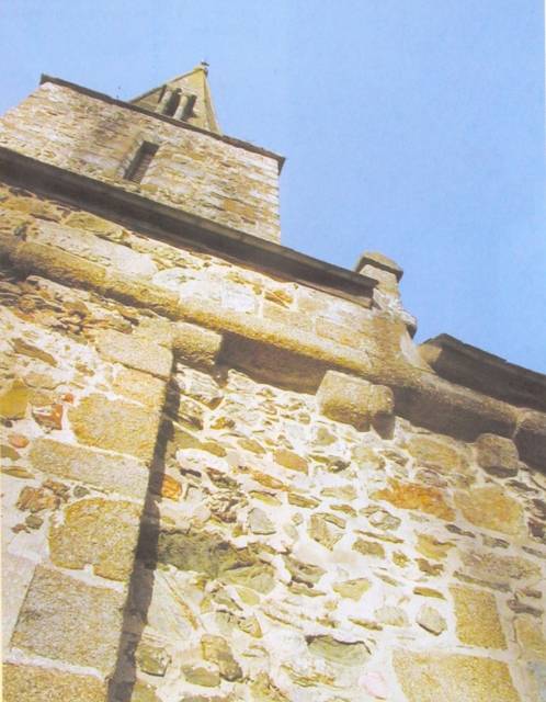 167. Saint-Léonard-de-Vains. The Romanesque tower. The masonry is made of irregular blocks of schist and granite, with a few rows of regular granite blocks. The saddleback roof rests north and south on a cornice supported by modillions. Photo by Alain Dermigny. [Alain-089]