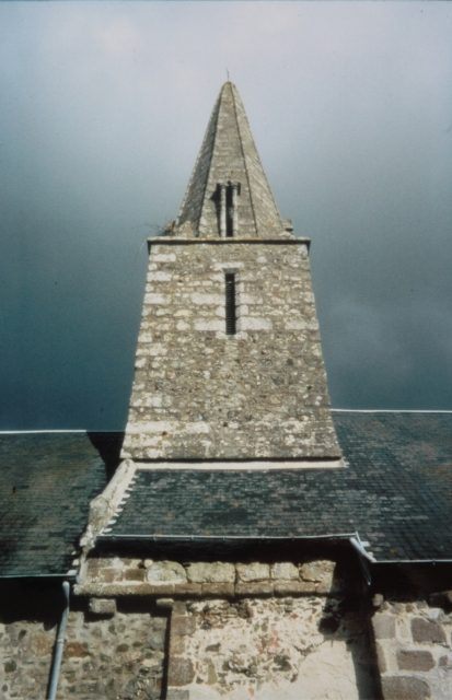 026. Bréville. The first floor and spire of the church tower. The first floor is opened on each side by a long narrow opening. The octagonal stone spire has angles rounded by tori, with a small gable with thin columns in the extension of each opening. Photo by Alain Dermigny. [Alain-011]