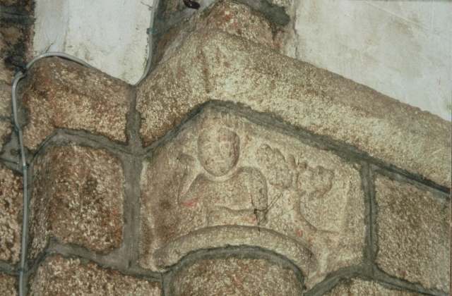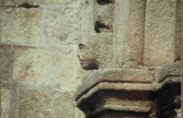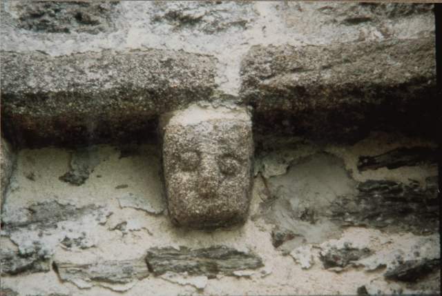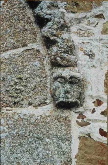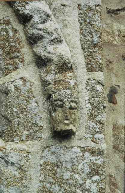 051. Yquelon. The Romanesque west gate. Detail of the semi-circular arch of the gate. Its archivolt rests at each end on a granite stone carved with a human head. These granite heads resisted more gracefully to the test of time than the limestone heads in the church of Bréville. Photo by Alain Dermigny. [Alain-029]