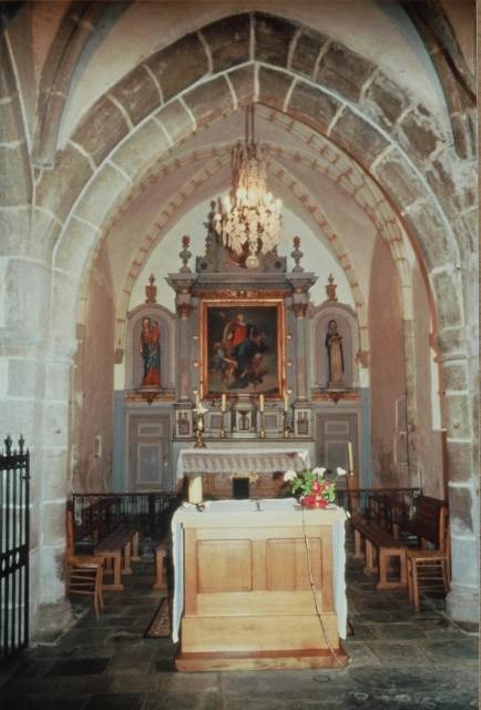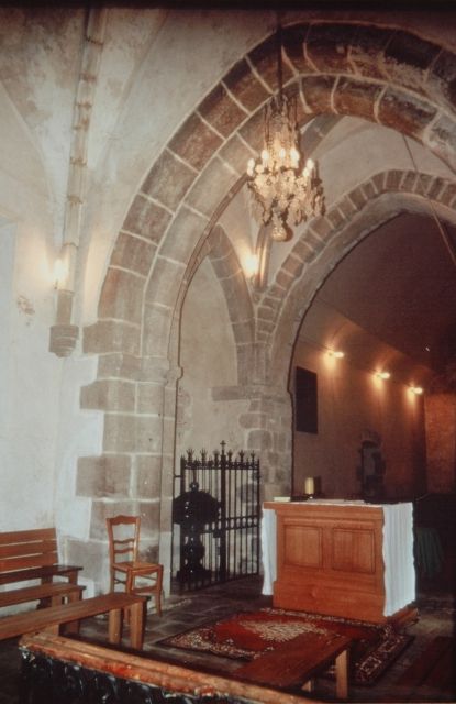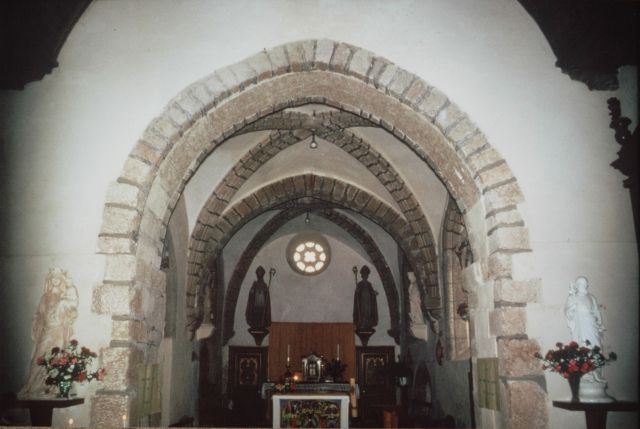 054. Yquelon. The Romanesque choir (inside). The nave opens on the choir with a very thick triumphal arch resting on two piers embedded into the thick wall. The two bays of the choir are separated by another very thick arch. Photo by Alain Dermigny. [Alain-030]