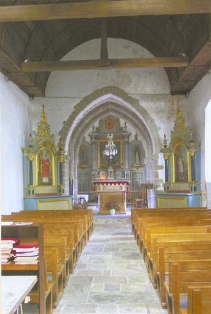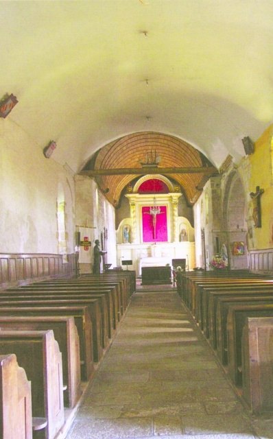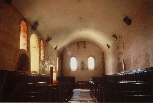 034. Bréville. The nave (inside). Its wooden ceiling was replaced by a plaster ceiling in 1852. The door and the large bay visible in the back wall - which is the west wall of the front — doesn't have much character because of the rebuilding of the church front in 1783. The pegged oak door is from 1970. In 1969, the walls were covered with a lime plaster, and the floor with schist pavings from Beauchamps. Photo by Alain Dermigny. [Alain-018]