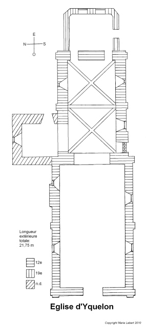 045. Yquelon. The church plan. Regularly oriented from west to east, the rectangular building has a two-row nave followed by a two-row choir with a flat apse. The whole building has an external length of 21,75 meters and an external width of 7,6 meters (width of the front). The tower is adjacent to the first row of the north side of the choir. Plan by Marie Lebert.