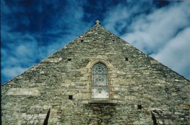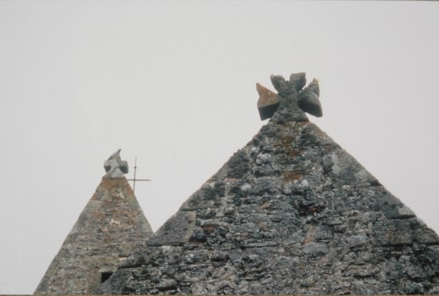 047. Yquelon. The Romanesque church front. Its gable wall is topped by an antefix cross with bifid branches. Photo by Alain Dermigny. [Alain-026]