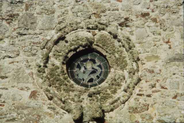 048. Yquelon. The Romanesque church front. The oculus in the gable wall is original. Its band is adorned with billets, with a stone carved with two human heads in high relief in its lower part. Photo by Alain Dermigny. [Alain-027]